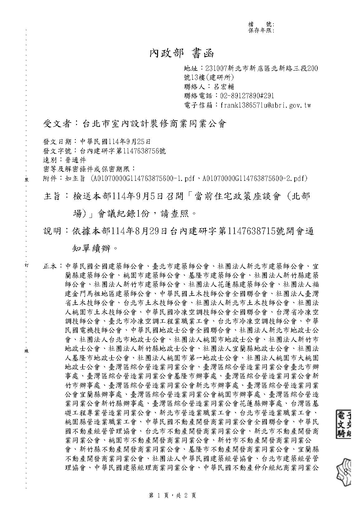 法規專區 法規查詢 法規公告 臺北市政府都發局 臺北市建築管理工程處 臺北市政府社會局 中華民國室內裝修全國聯合會 轉知公文 各縣市政府 會議記錄 其他(各種單位) 主管機關網站 鑑定鑑價 證照資訊 室裝Q&A 法規查詢 法規公告 臺北市政府都發局 臺北市建築管理工程處 臺北市政府社會局 中華民國室內裝修全國聯合會 轉知公文 各縣市政府 會議記錄 其他(各種單位) 主管機關網站 鑑定鑑價 證照資訊 室裝Q&A 檢送本部114年9月5日召開「當前住宅政策座談會 (北部 場)」會議紀錄1份,請查照。 (北部場)會議紀錄連結 <<點擊前往>>
