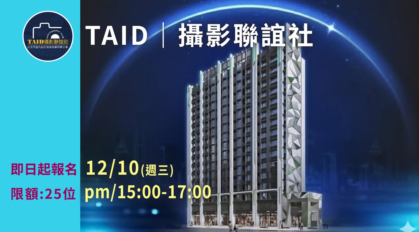 報名專區 公會講座/課程 友會講座/課程 聯誼社活動 參訪/旅遊活動 活動行事曆 人文講堂空間租借 公會講座/課程 友會講座/課程 聯誼社活動 參訪/旅遊活動 活動行事曆 人文講堂空間租借 聯誼社活動 搜尋:日期搜尋 聯誼社活動 TAID單車聯誼社 | 元月份活動 2026 年 1 月 5 日 聯誼社活動 TAID書法聯誼社 | 二月份活動 2025 年 12 月 30 日 聯誼社活動 TAID藝文聯誼社 | 十二月份活動 2025 年 12 月 4 日 聯誼社活動 TAID攝影聯誼社 | 十二月份活動 2025 年 11 月 28 日 聯誼社活動 TAID單車聯誼社 | 十二月份活動 2025 年 11 月 17 日 Prev12345Next