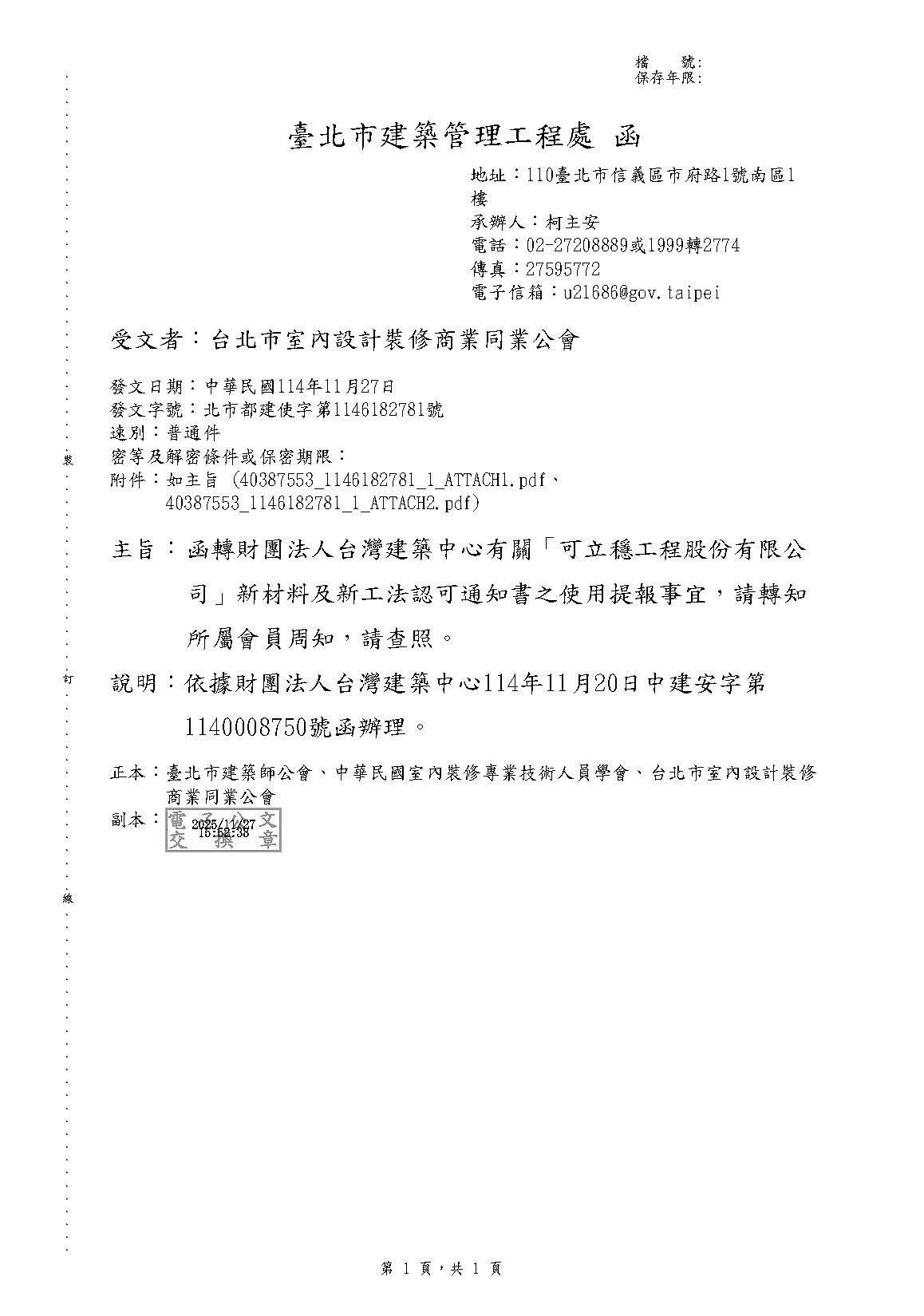 最新消息 一般公文 轉知公文 代轉活動 全國公會重要公文 公會活動花絮 招標公告 114年度 115年度 研討活動/會議 廠商訊息 一般公文 轉知公文 代轉活動 全國公會重要公文 公會活動花絮 招標公告 114年度 115年度 研討活動/會議 廠商訊息 臺北市建築管理工程處 函轉財團法人台灣建築中心有關「可立穩工程股份有限公司」新材料及新工法認可通知書之使用提報事宜,請轉知所屬會員周知,請查照。 文章分類 : 轉知公文 發文單位 : 臺北市建築管理工程處 發文字號 : 北市都建使字第1146182781號 收文日期 : 114-12-01 公文內容 <<點擊前往>>