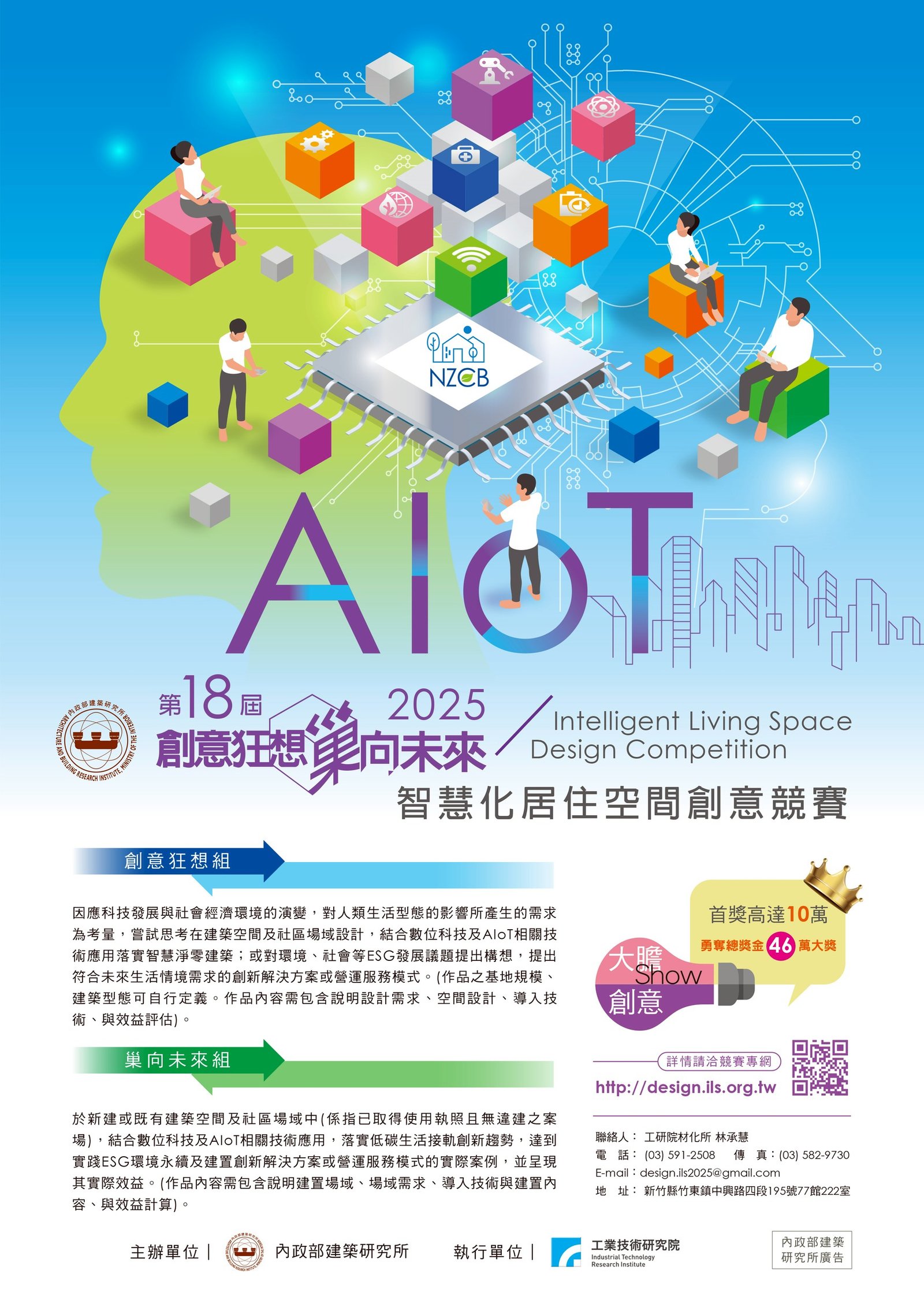 最新消息 一般公文 轉知公文 代轉活動 全國公會重要公文 公會活動花絮 招標公告 114年度 研討活動/會議 廠商訊息 一般公文 轉知公文 代轉活動 全國公會重要公文 公會活動花絮 招標公告 114年度 研討活動/會議 廠商訊息 財團法人工業技術研究院 「創意狂想 巢向未來」 智慧化居住 空間創意競賽 內政部建築研究所自民國95年創辦「創意狂想 巢向未來」智慧化居住空間創意競賽,至今已邁入第18屆。競賽以使用者需求為核心,鼓勵結合數位科技與創新設計,推動居住空間智慧轉型,帶動建築邁向淨零排放並促進 AIoT 產業發展。除創意設計外,亦邀請業界提出實際建置案例,展現新建及既有建築成果,提供產官學各界參考。歷年共累積3,586件參賽作品,公開表揚287件優秀成果,並舉辦159場次推廣活動,吸引逾7,000人次參與,成功推動智慧居住理念普及與產業發展。 活動官網 <<點擊前往>> 競賽公告 <<點擊前往>>