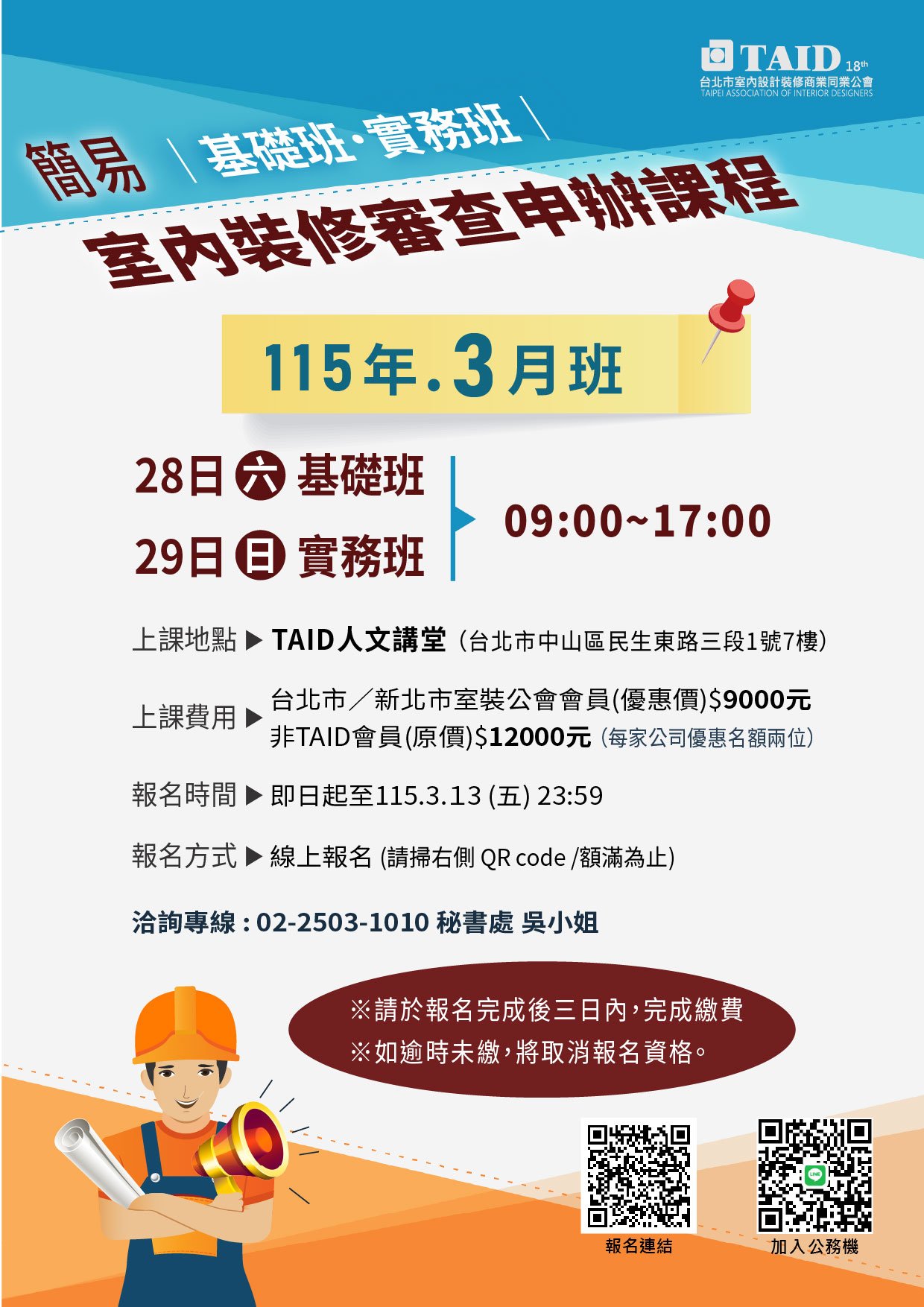 報名專區 公會講座/課程 友會講座/課程 聯誼社活動 參訪/旅遊活動 活動行事曆 人文講堂空間租借 公會講座/課程 友會講座/課程 聯誼社活動 參訪/旅遊活動 活動行事曆 人文講堂空間租借 TAID 專業課程開班訊息 115年度簡易室內裝修審查申辦課程🔥開課囉! 📢 還在煩惱裝修審查怎麼申請? 📄 表單太多?眼花撩亂? 🛠️ 文件怎麼準備才不會退件? 🧩 案例怎麼拆解才好送件? 🧑🏫 本課程由專業建築師+實戰派講師聯手授課,從零開始帶你學會整套裝修審查申辦流程! 🔍你將學到: ✅ 表單填寫技巧 ✅ 文件準備要訣 ✅ 實作演練+案例彙整 ✅ 獨家實務手冊免費帶回家! 📅 日期:115年03月28日(六) 03月29日(日),共兩日⏰ 時間:上午9點至下午5點📍 地點:TAID人文講堂(台北市中山區民生東路三段1號7樓) 🎯 招生名額 : 60位(不限身分,額滿為止)💰 台北市/新北市室裝公會會員優惠價 $9,000(每家公司限2位)➡️非會員原價 $12,000⏳ 報名截止:3月13日(四)下午23:59前! 名額有限!!!趕快手刀報名 🔷主辦單位:TAID室裝審查委員會👉活動報名連結