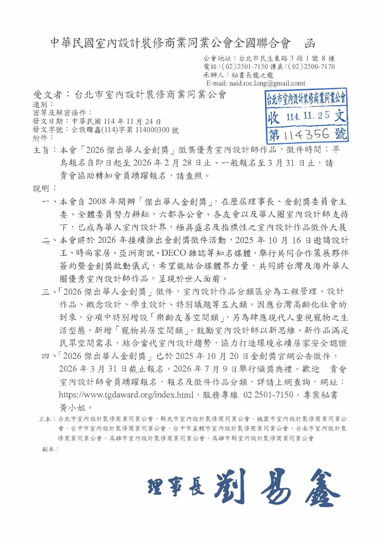 最新消息 一般公文 轉知公文 代轉活動 全國公會重要公文 公會活動花絮 招標公告 114年度 115年度 研討活動/會議 廠商訊息 一般公文 轉知公文 代轉活動 全國公會重要公文 公會活動花絮 招標公告 114年度 115年度 研討活動/會議 廠商訊息 中華民國室內設計裝修商業同業公會全國聯合會 2026 全球傑出華人室內設計金創獎 本會「2026傑出華人金創獎」徵集優秀室內設計師作品,徵件時間:早鳥報名自即日超至2026年2月28日止 、 一般報名至3月31日止,請貴會協助轉知會員踴躍報名,請查照。 金創獎官網 <<點擊前往>>