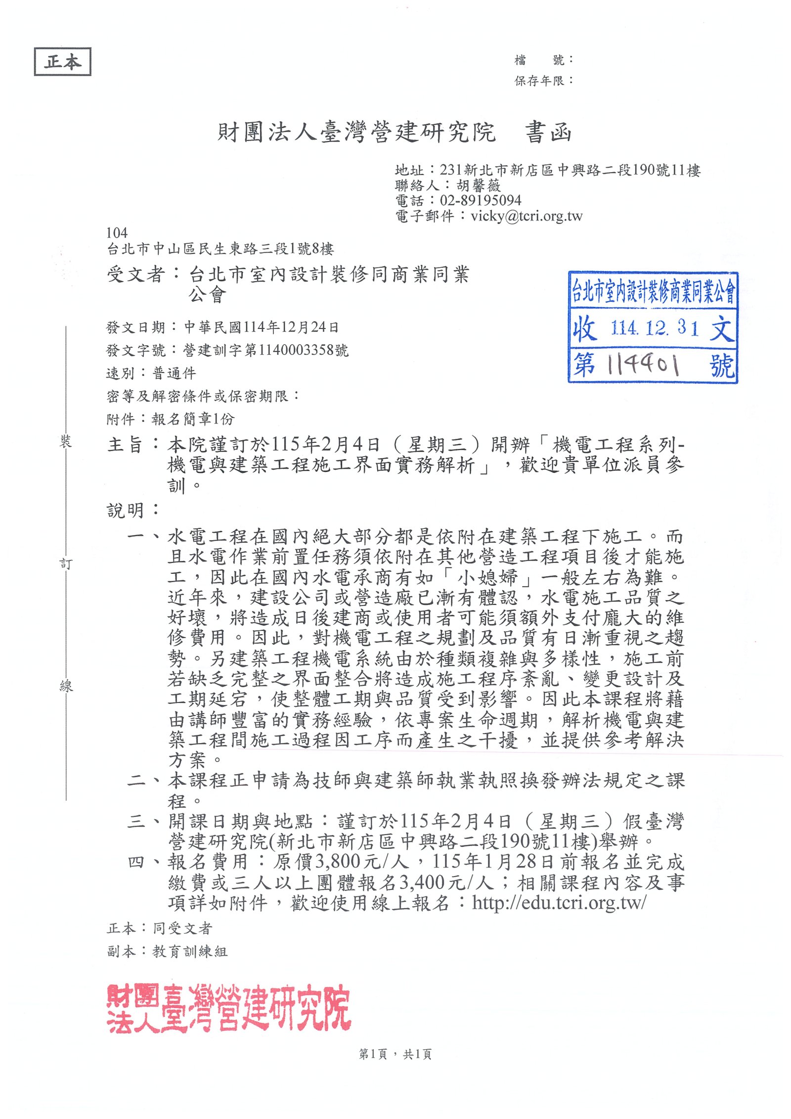 最新消息 一般公文 轉知公文 代轉活動 全國公會重要公文 公會活動花絮 招標公告 114年度 115年度 研討活動/會議 廠商訊息 一般公文 轉知公文 代轉活動 全國公會重要公文 公會活動花絮 招標公告 114年度 115年度 研討活動/會議 廠商訊息 財團法人台灣營建研究所 本院謹訂於115年2月4日(星期三)開辦「機電工程系列-機電與建築工程施工界面實務解析」,歡迎貴單位派員參訓。 文章分類 : 轉知公文 發文單位 : 財團法人台灣營建研究所 發文字號 : 營建訓字第1140003358號 收文日期 : 114-12-31 線上報名 <<點擊前往>>