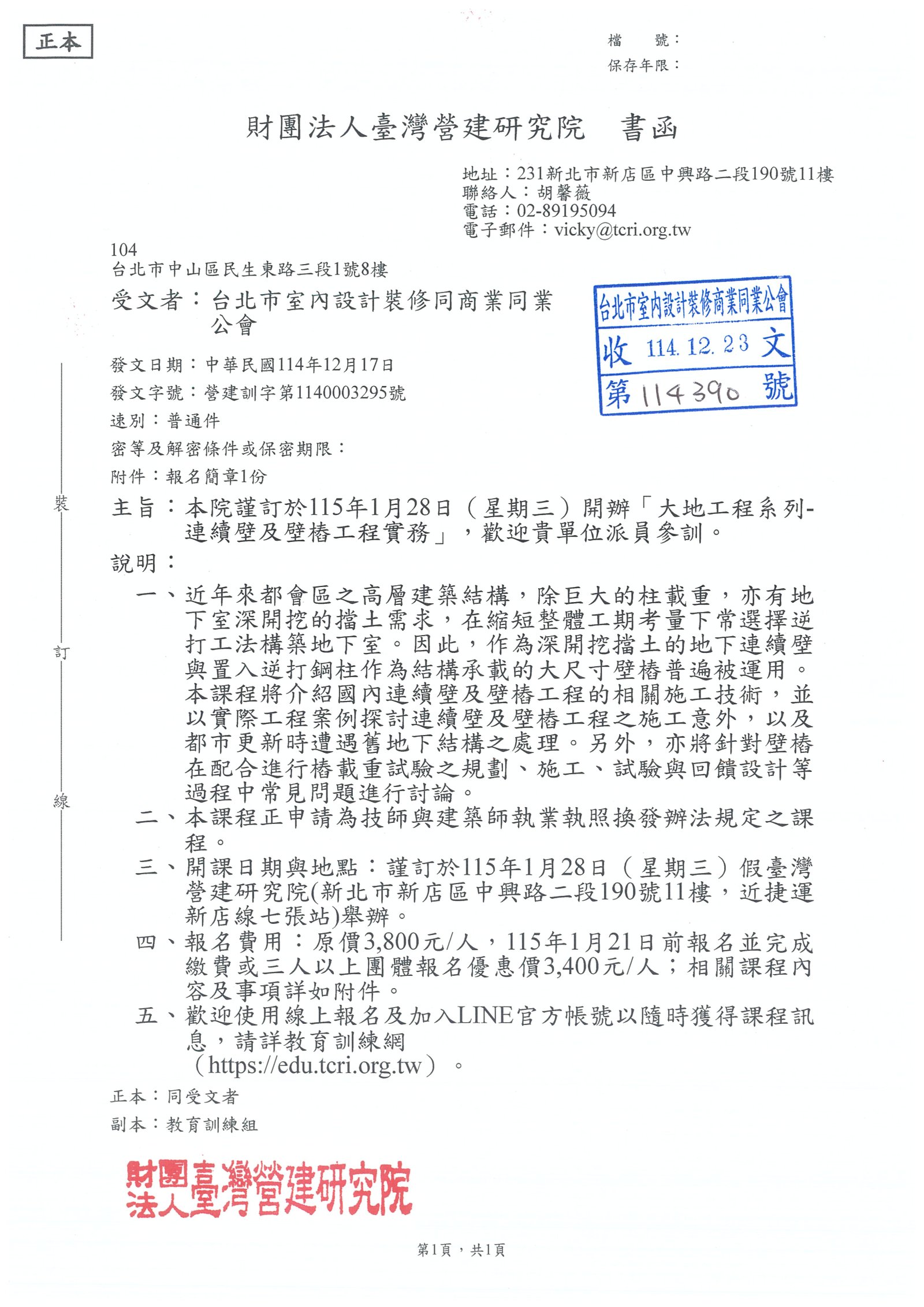 最新消息 一般公文 轉知公文 代轉活動 全國公會重要公文 公會活動花絮 招標公告 114年度 115年度 研討活動/會議 廠商訊息 一般公文 轉知公文 代轉活動 全國公會重要公文 公會活動花絮 招標公告 114年度 115年度 研討活動/會議 廠商訊息 財團法人臺灣營建研究院 本院謹訂於115年1月28日(星期三)開辦「大地工程系列-連續壁及壁樁工程實務」,歡迎 貴單位派員參訓。 文章分類 : 轉知公文 發文單位 : 財團法人臺灣營建研究院 發文字號 : 營建訓字第1140003295號 收文日期 : 114-12-23 線上報名 <<點擊前往>>