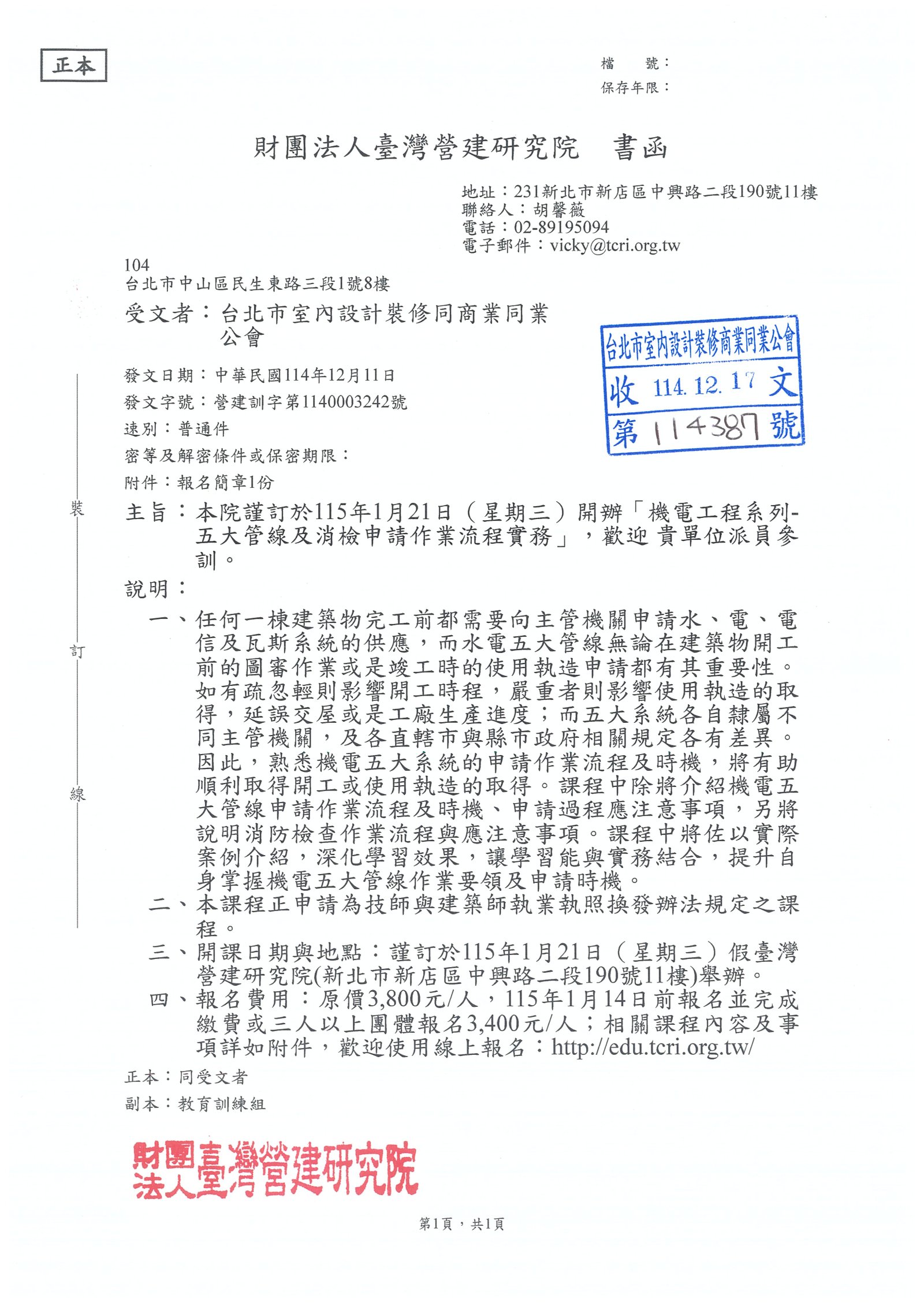 最新消息 一般公文 轉知公文 代轉活動 全國公會重要公文 公會活動花絮 招標公告 114年度 研討活動/會議 廠商訊息 一般公文 轉知公文 代轉活動 全國公會重要公文 公會活動花絮 招標公告 114年度 研討活動/會議 廠商訊息 財團法人臺灣營建研究院 本院謹訂於115年1月21日(星期三)開辦「機電工程系列-五大管線及消檢申請作業流程實務」,歡迎 貴單位派員參訓。 文章分類 : 轉知公文 發文單位 : 財團法人臺灣營建研究院 發文字號 : 營建訓字第1140003242號 收文日期 : 114-12-17 線上報名 <<點擊前往>>