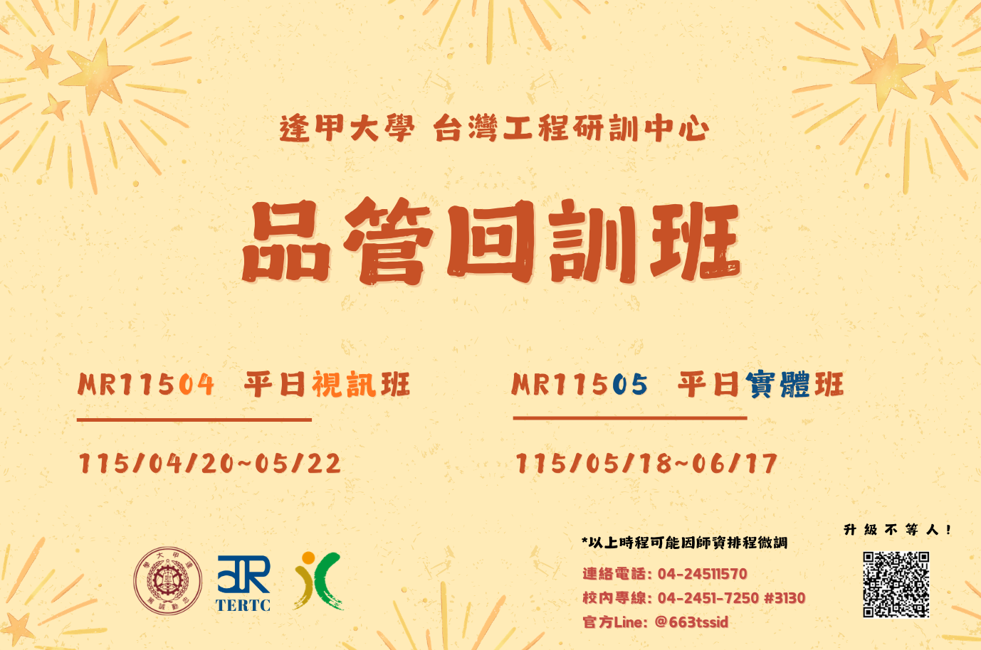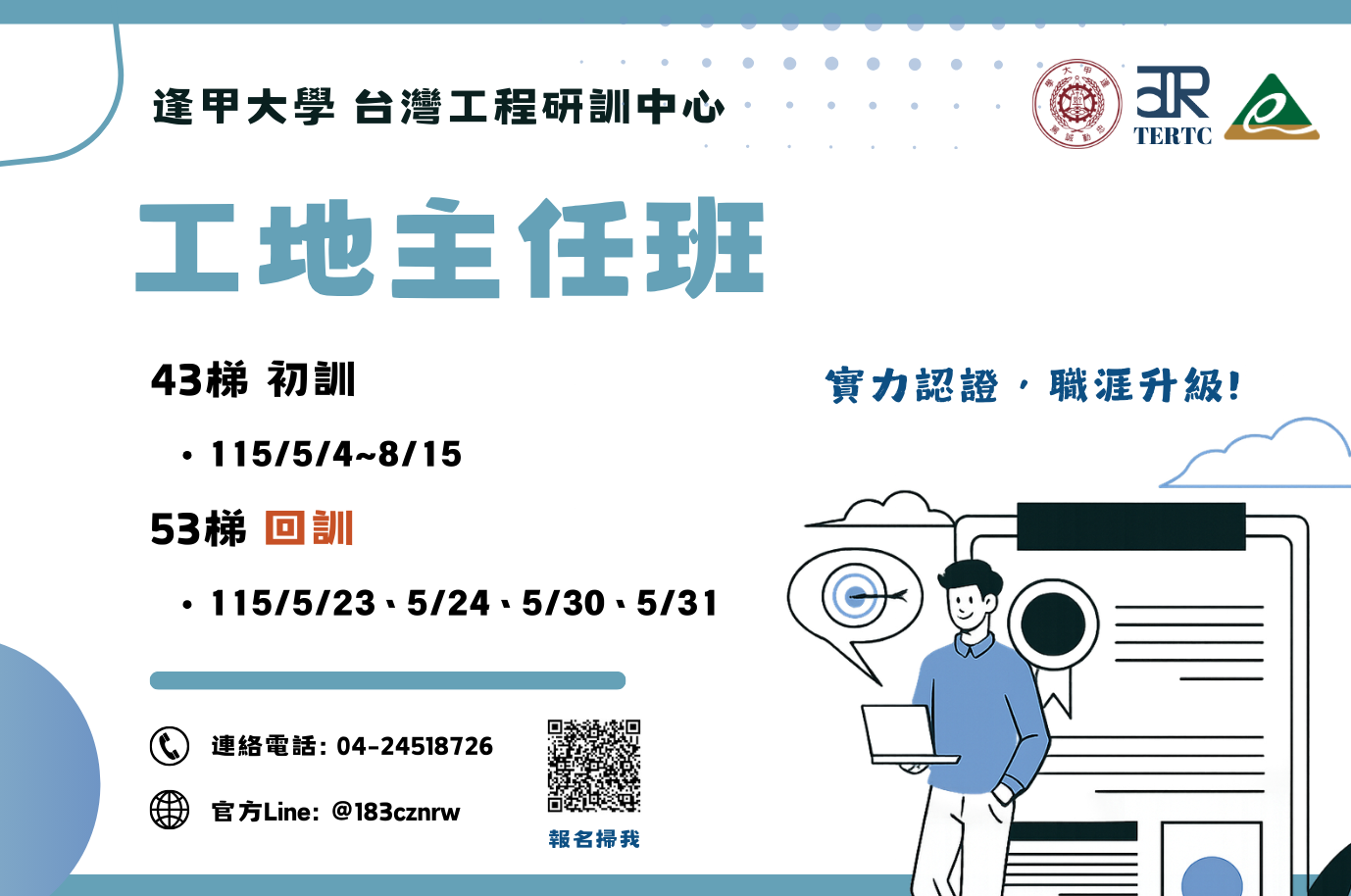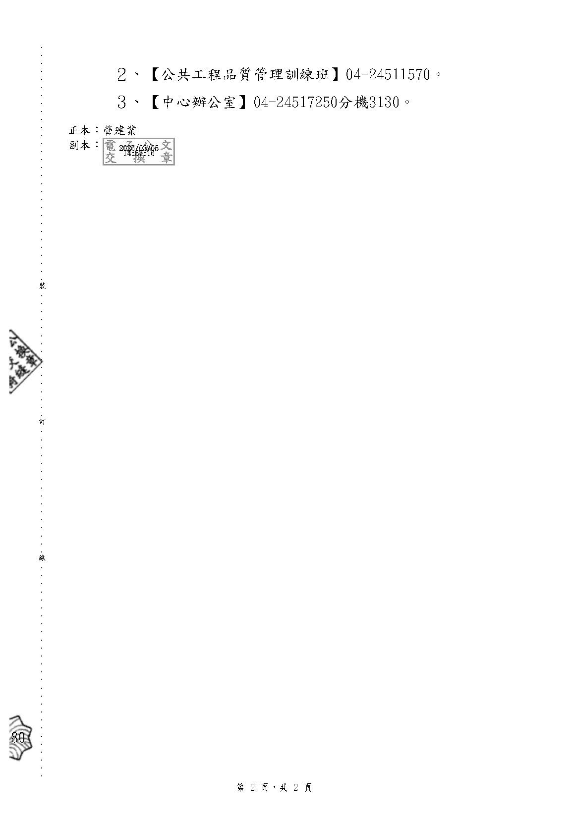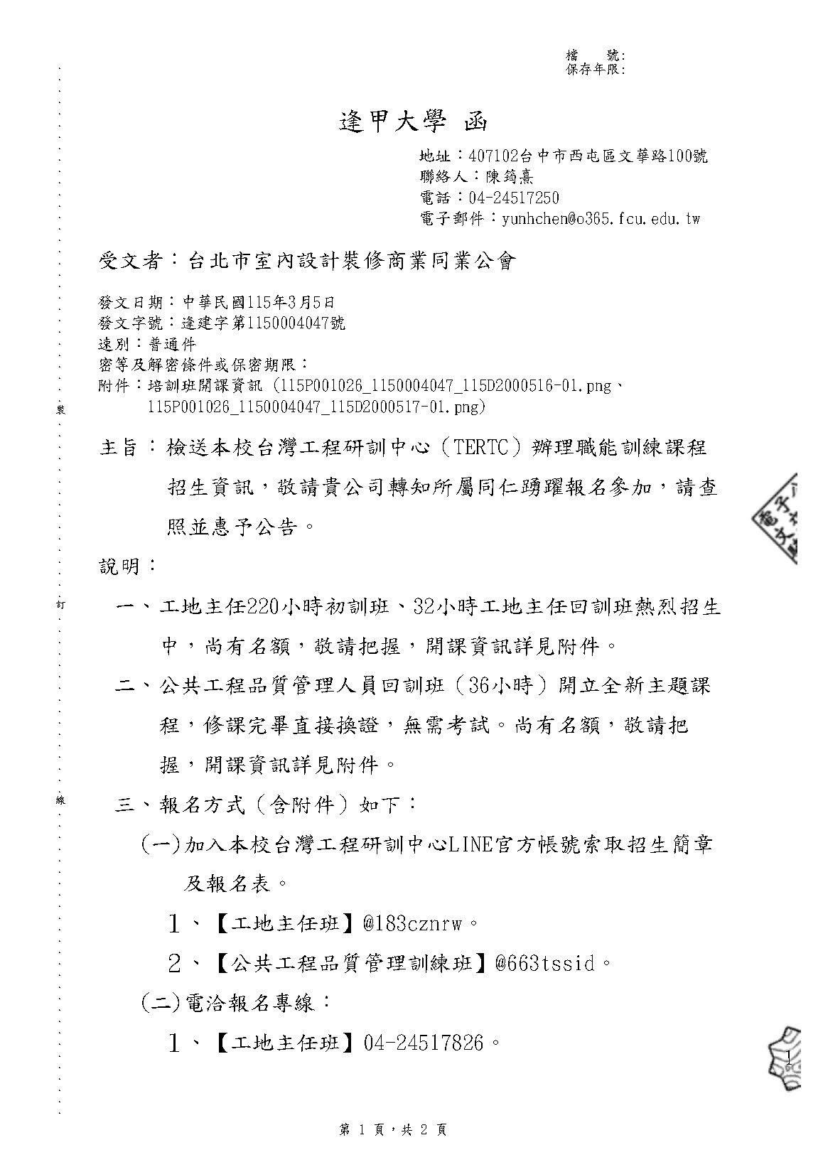 最新消息 一般公文 轉知公文 代轉活動 全國公會重要公文 公會活動花絮 招標公告 114年度 115年度 研討活動/會議 廠商訊息 一般公文 轉知公文 代轉活動 全國公會重要公文 公會活動花絮 招標公告 114年度 115年度 研討活動/會議 廠商訊息 逢甲大學 檢送本校台灣工程研訓中心(TERTC)辦理職能訓練課程招生資訊,敬請貴公司轉知所屬同仁踴躍報名參加,請查照並惠予公告。 文章分類 : 轉知公文 發文單位 : 逢甲大學 發文字號 : 逢建字第1150004047號 收文日期 : 115-03-05
