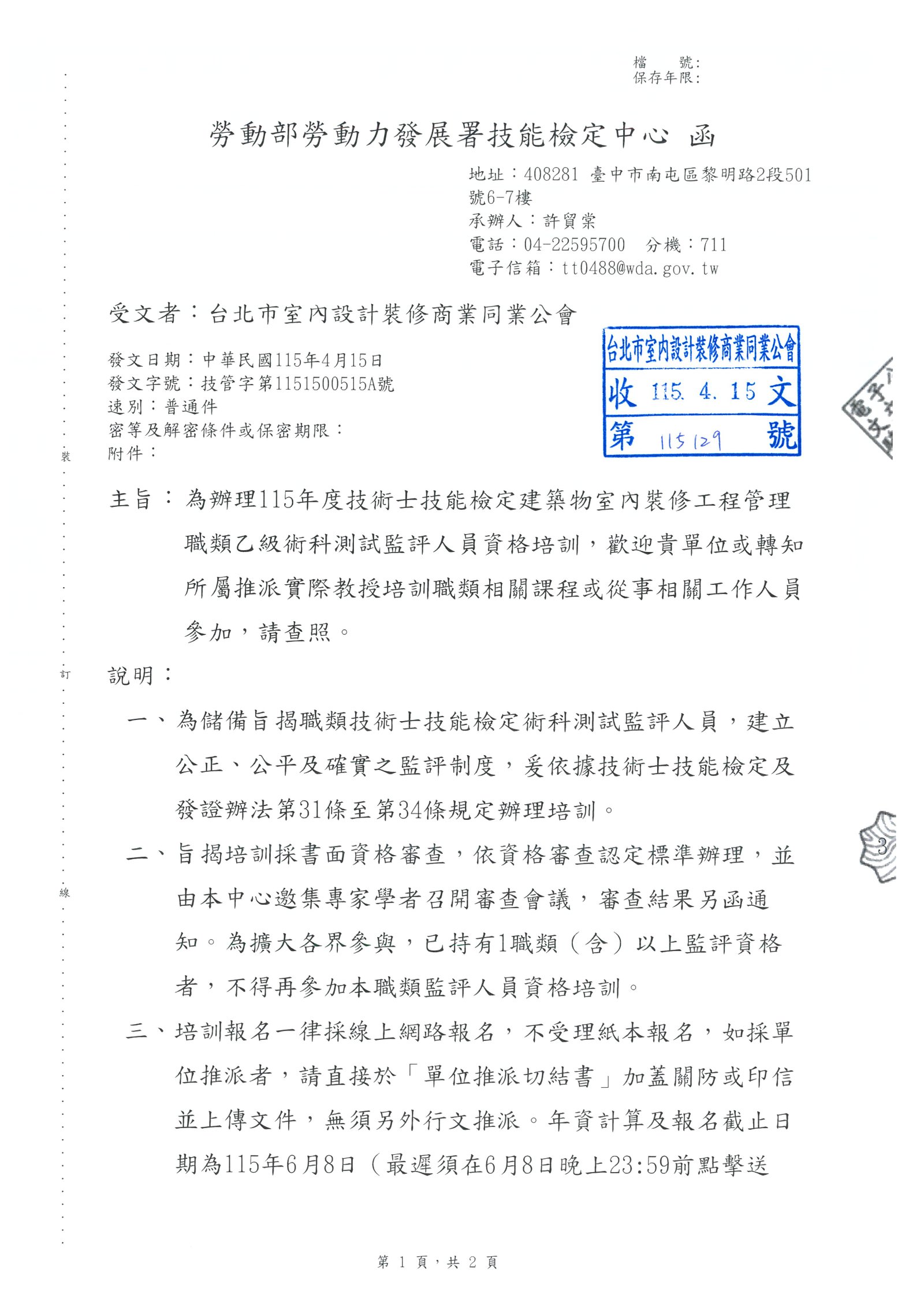 為辦理115年度技術士技能檢定建築物室內裝修工程管理職類乙級術科測試監評人員資格培訓,歡迎貴單位或轉知所屬推派實際教授培訓職類相關課程或從事相關工作人員參加,請查照。