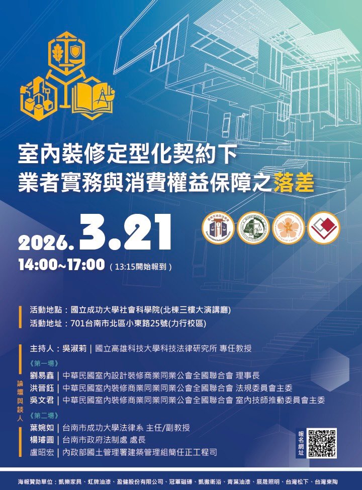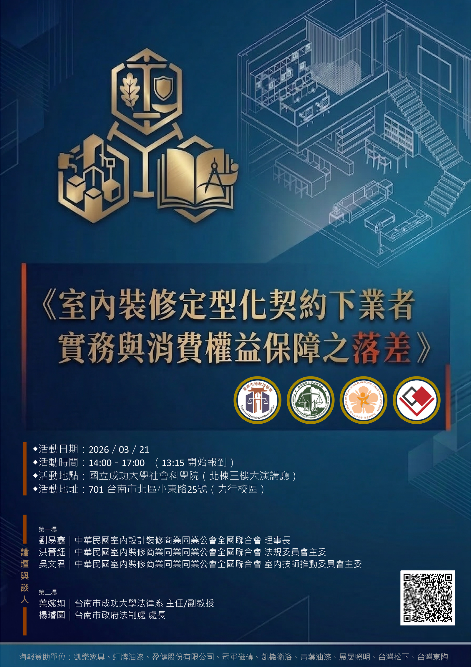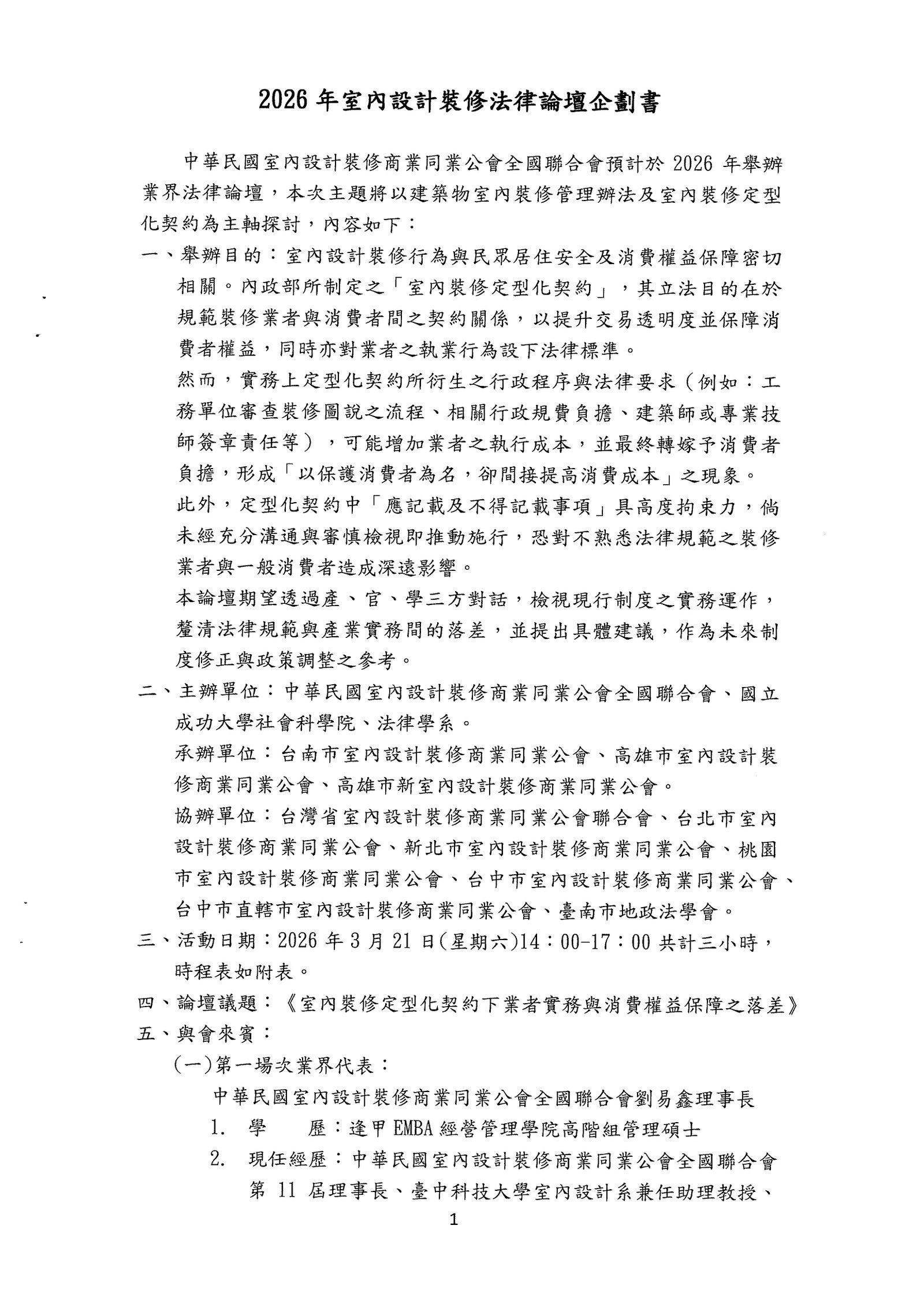 最新消息 一般公文 轉知公文 代轉活動 全國公會重要公文 公會活動花絮 招標公告 114年度 115年度 研討活動/會議 廠商訊息 一般公文 轉知公文 代轉活動 全國公會重要公文 公會活動花絮 招標公告 114年度 115年度 研討活動/會議 廠商訊息 中華民國室內設計裝修商業同業公會全國聯合會 2026室內設計裝修法律論壇 本會與國立成功大學社會科學院、法律學系共同主辦「2026室內設計裝修法律論壇」,邀請貴會為協辦單位,請轉知會員踴躍報名參加,請查照。