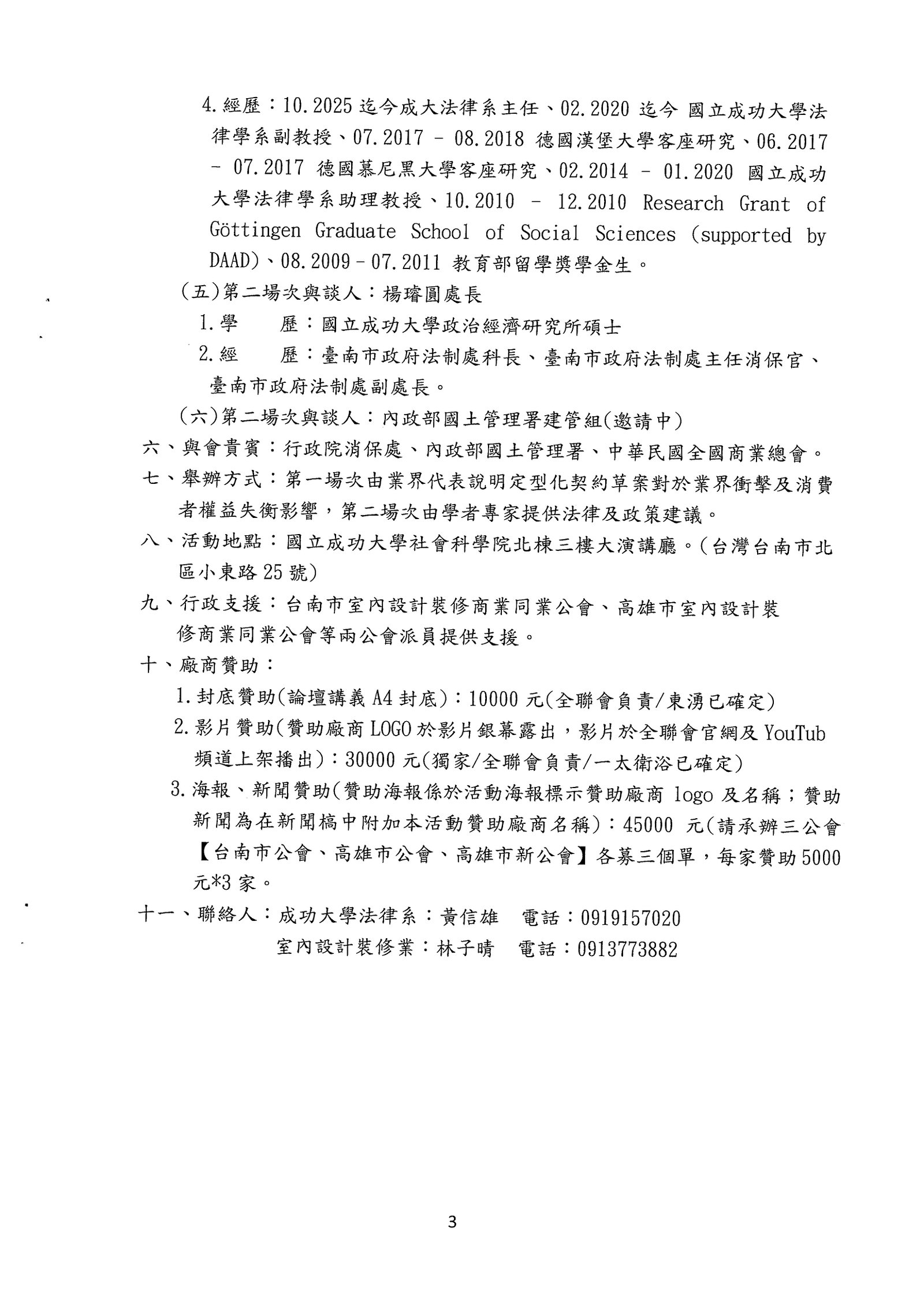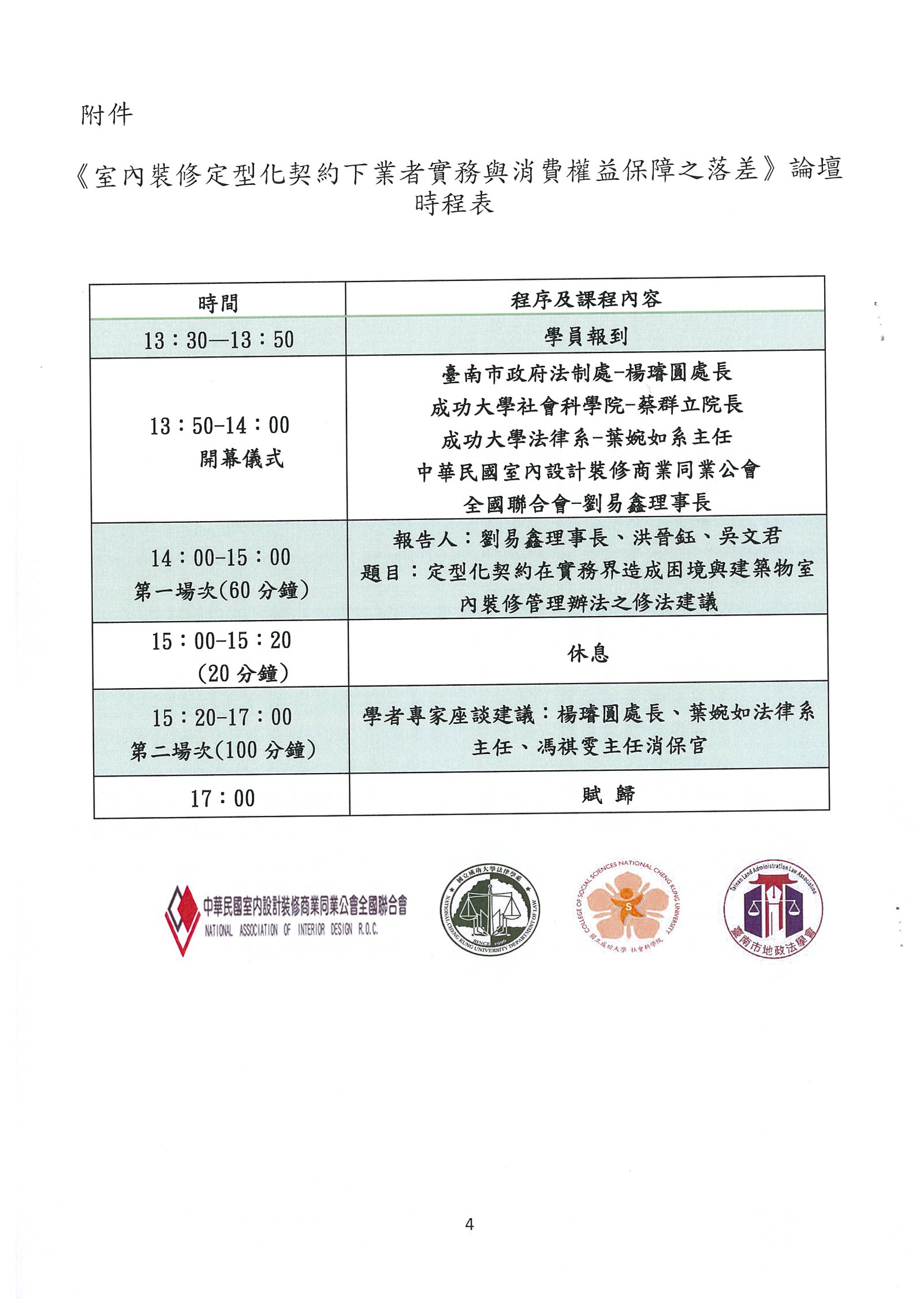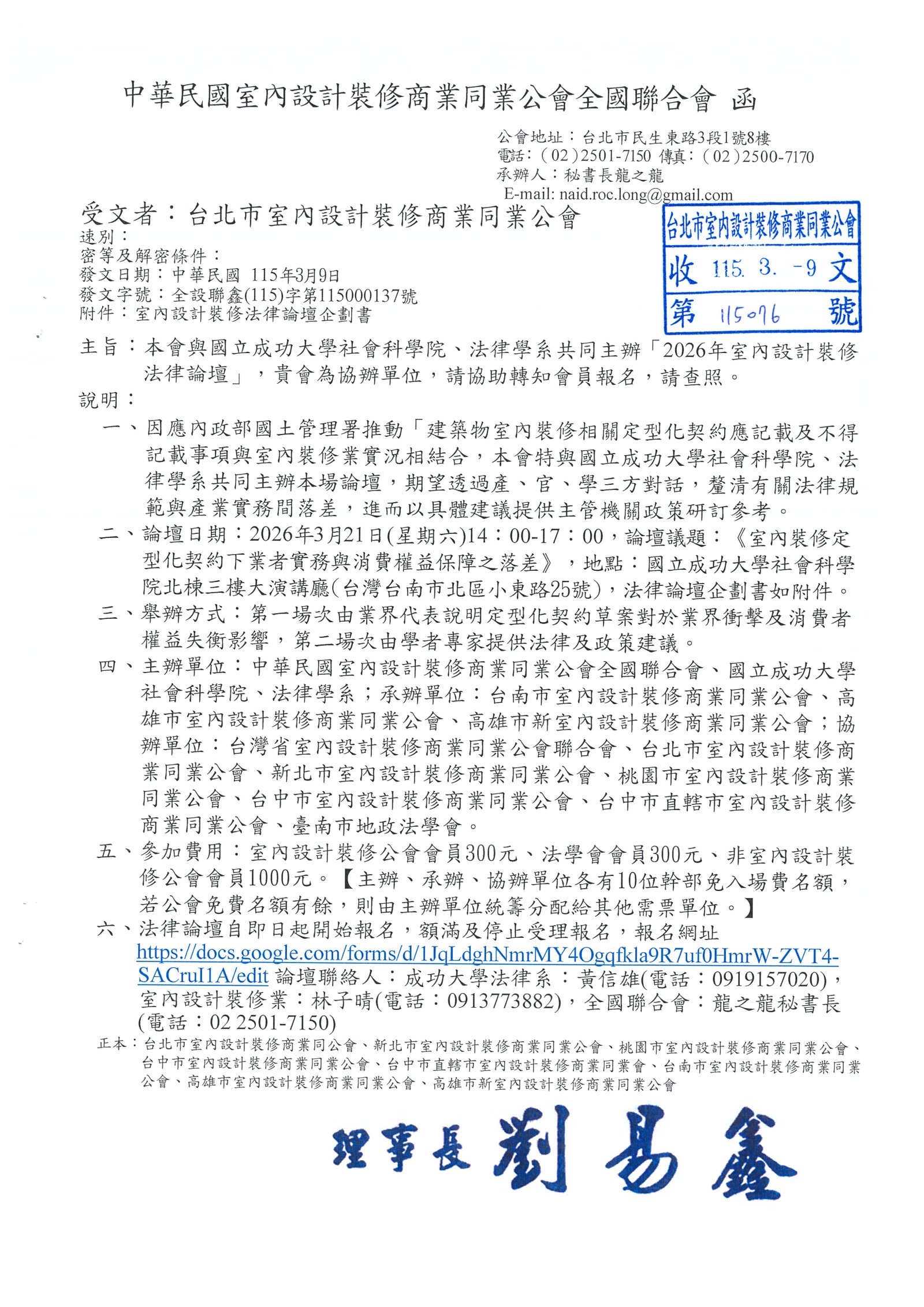 最新消息 一般公文 轉知公文 代轉活動 全國公會重要公文 公會活動花絮 招標公告 114年度 115年度 研討活動/會議 廠商訊息 一般公文 轉知公文 代轉活動 全國公會重要公文 公會活動花絮 招標公告 114年度 115年度 研討活動/會議 廠商訊息 中華民國室內設計裝修商業同業公會全國聯合會 2026室內設計裝修法律論壇 本會與國立成功大學社會科學院、法律學系共同主辦「2026室內設計裝修法律論壇」,邀請貴會為協辦單位,請轉知會員踴躍報名參加,請查照。