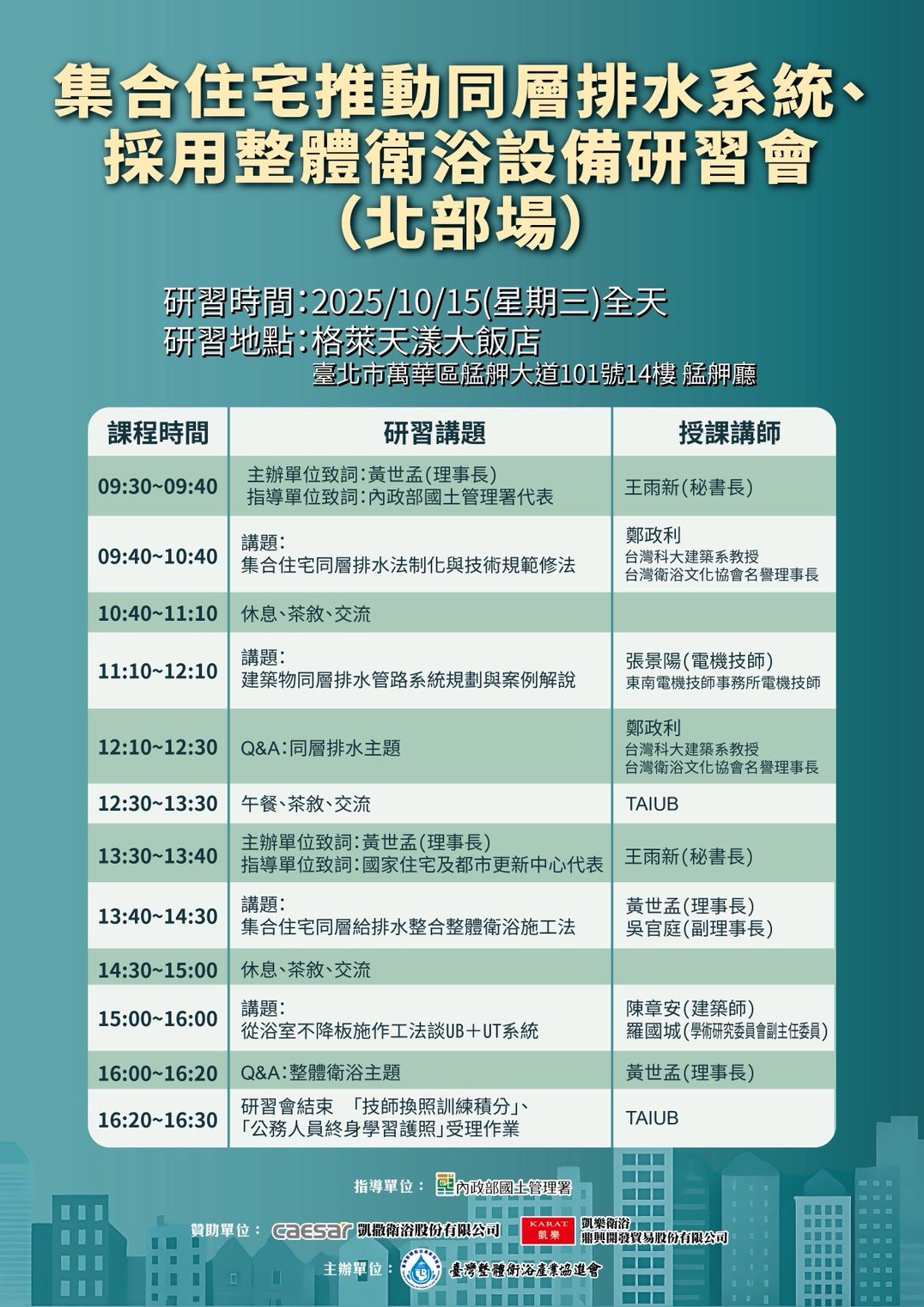 二、為協助公寓大廈及社會住宅提升建築品質,本會將於2025年10月15日(星期三)假臺北市格萊天漾大飯店14樓艋舺廳舉辦「集合住宅推動同層排水系統、採用整體衛浴設備研習會(北部場)」。