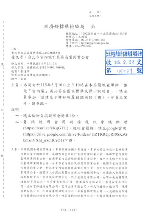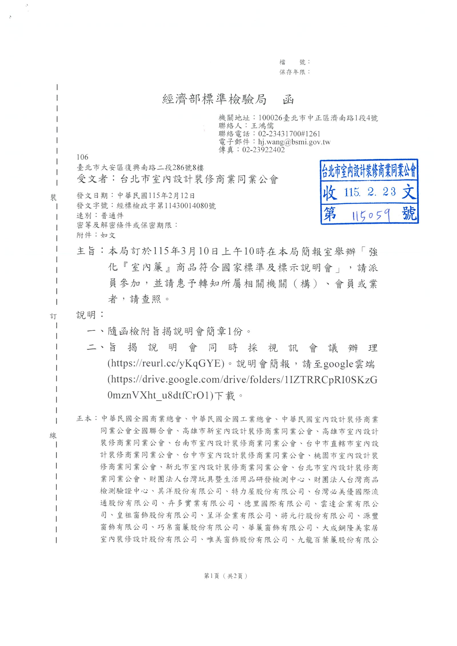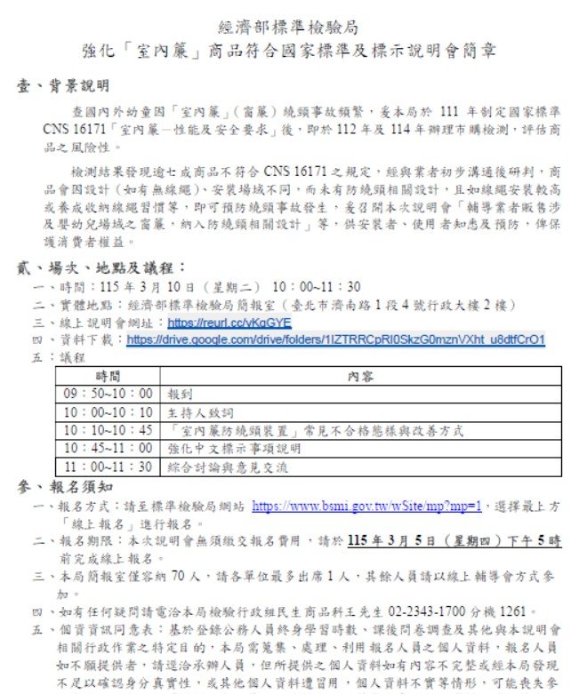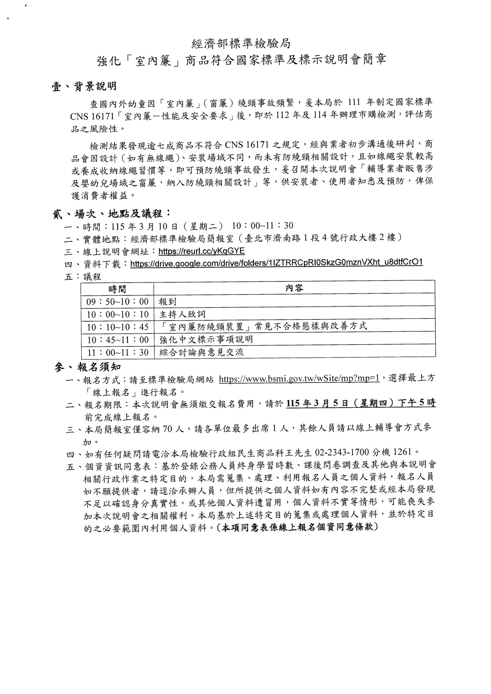 最新消息 一般公文 轉知公文 代轉活動 全國公會重要公文 公會活動花絮 招標公告 114年度 115年度 研討活動/會議 廠商訊息 一般公文 轉知公文 代轉活動 全國公會重要公文 公會活動花絮 招標公告 114年度 115年度 研討活動/會議 廠商訊息 經濟部標準檢驗局 本局訂於115年3月10日上午10時在本局簡報室舉辦「強化『室內簾』商品符合國家標準及標示說明會」,請派員參加,並請惠予轉知所屬相關機關(構)、會員或業者,請查照。 文章分類 : 轉知公文 發文單位 : 經濟部標準檢驗局 發文字號 : 經標檢政字第11430014080號 收文日期 : 115-02-23 報名方式 <<點擊前往>> 會議資料: <<點擊前往>>