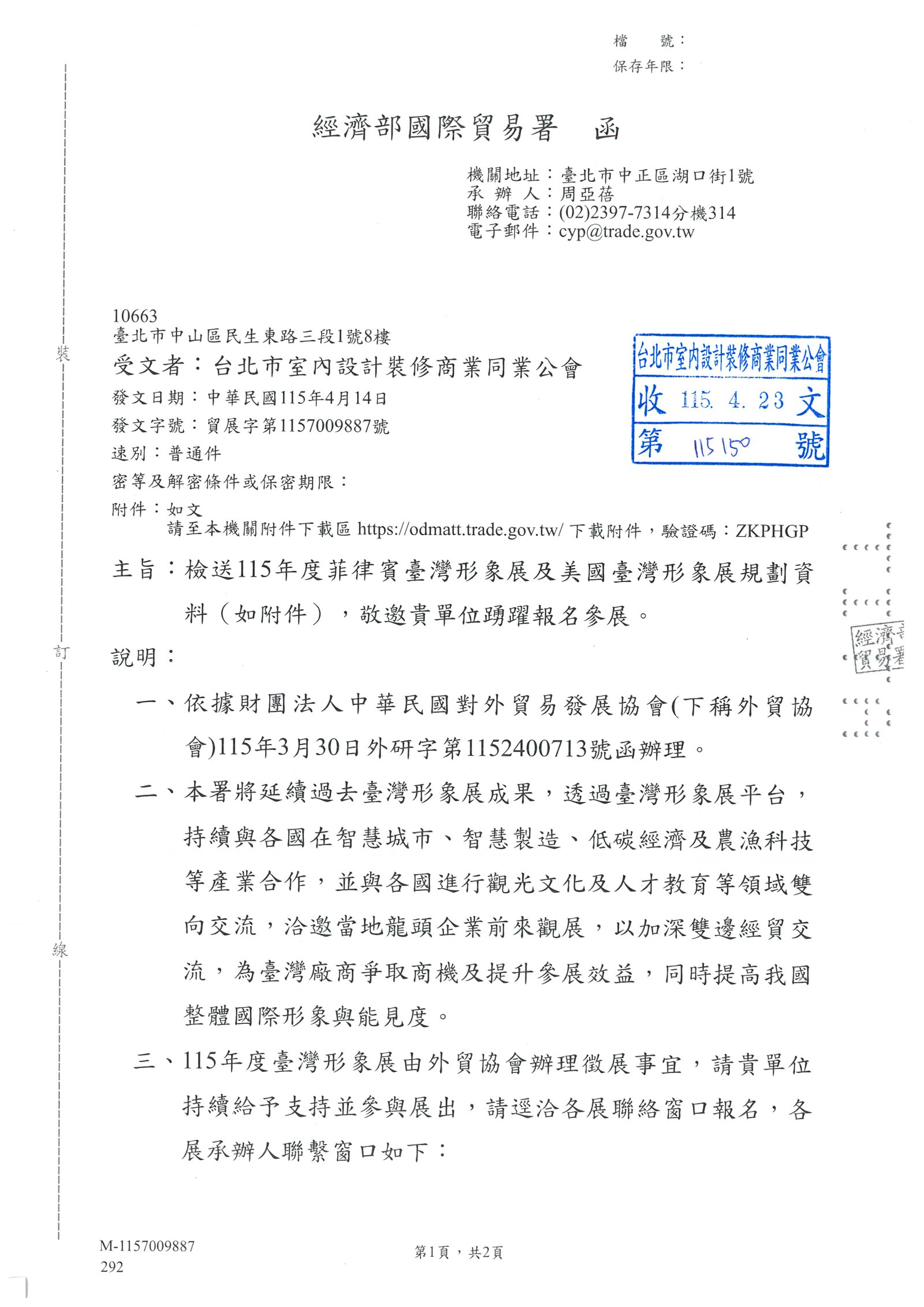 • 經濟部國際貿易署 | 檢送115年度菲律賓臺灣形象展及美國臺灣形象展規劃資料