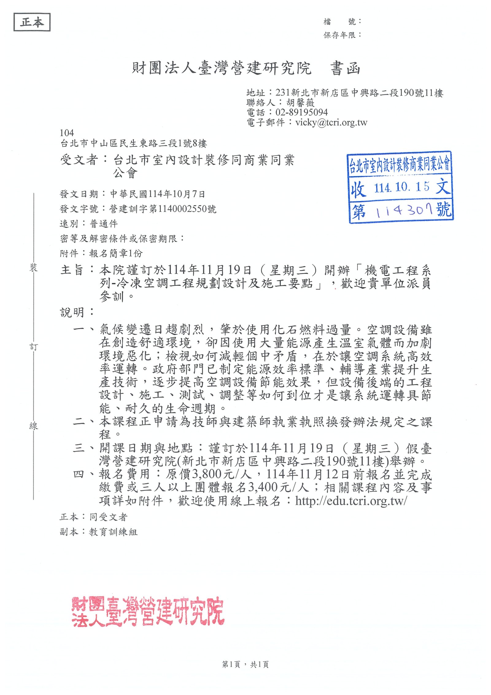 最新消息 一般公文 轉知公文 代轉活動 全國公會重要公文 公會活動花絮 招標公告 114年度 研討活動/會議 廠商訊息 一般公文 轉知公文 代轉活動 全國公會重要公文 公會活動花絮 招標公告 114年度 研討活動/會議 廠商訊息 財團法人臺灣營建研究院 本院謹訂於114年11月19日(星期三)開辦「機電工程系列-冷凍空調工程規劃設計及施工要點」,歡迎貴單位派員參訓。 文章分類 : 轉知公文 發文單位 : 財團法人臺灣營建研究院 發文字號 : 營建訓字第1140002550號 收文日期 : 114-10-15 課程介紹 <<點擊前往>>