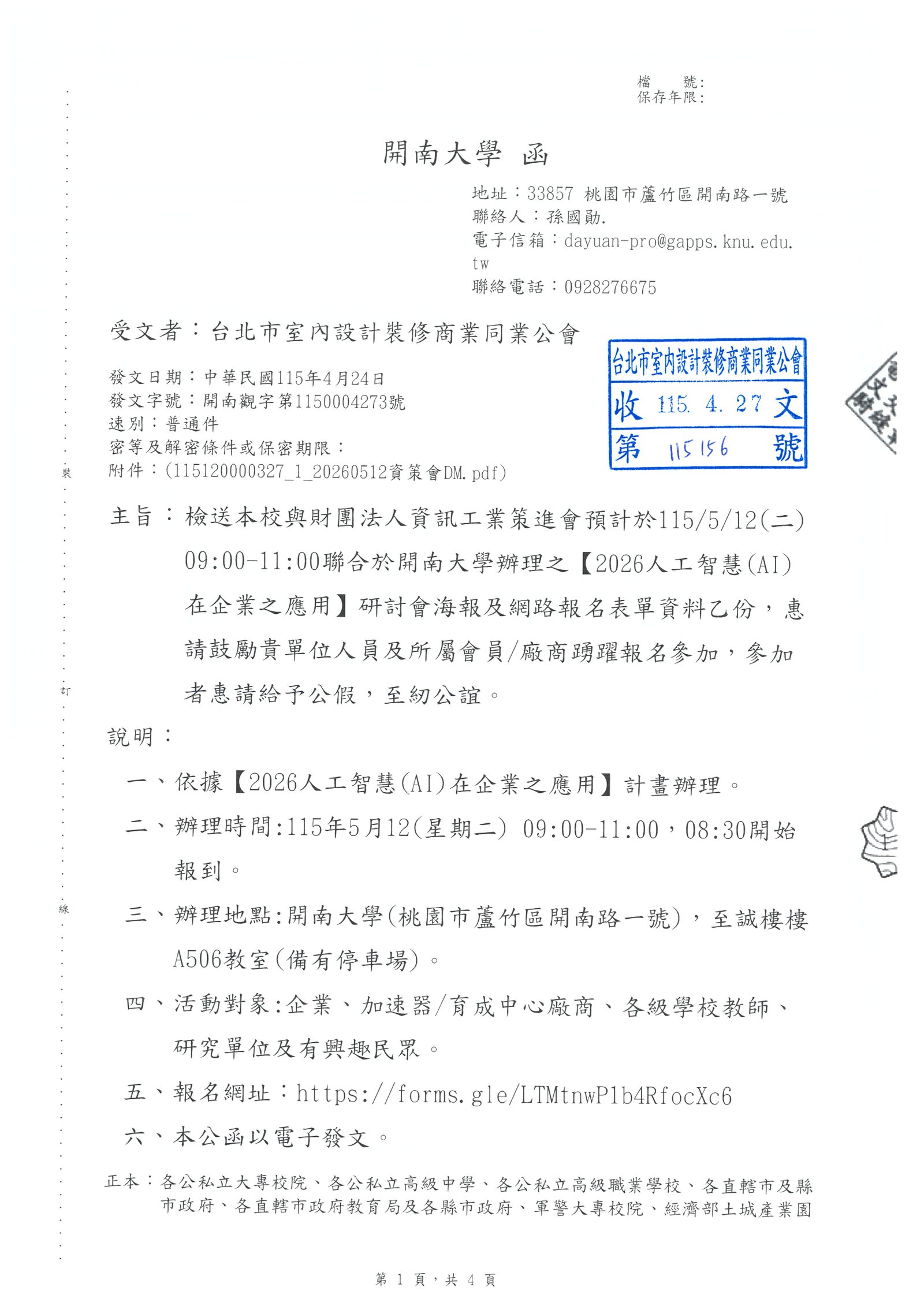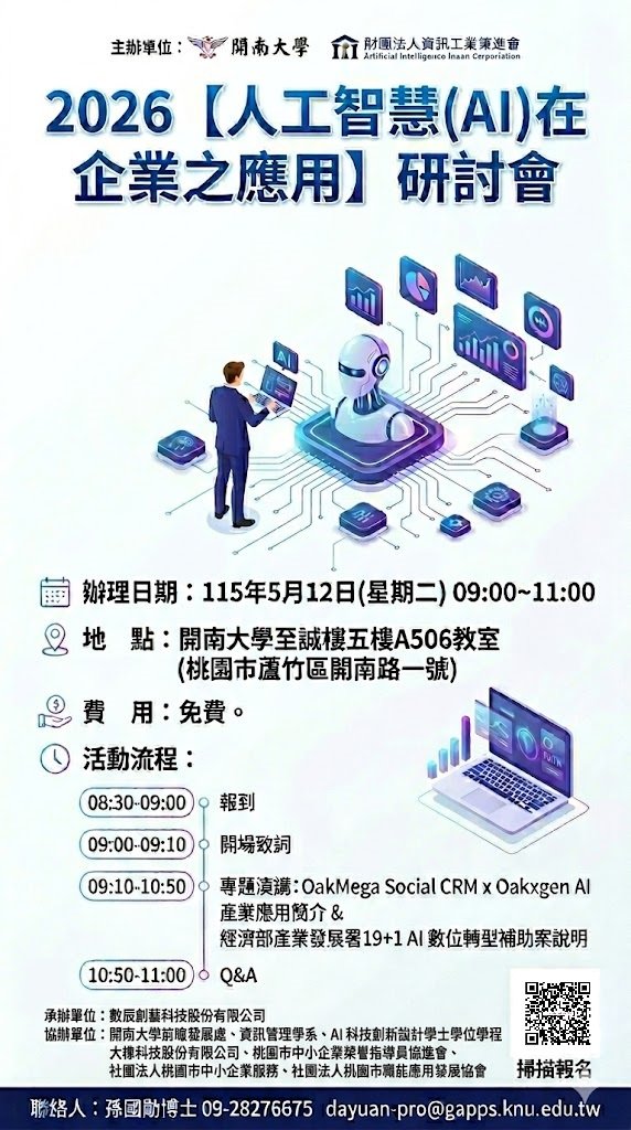 最新消息 一般公文 轉知公文 代轉活動 全國公會重要公文 公會活動花絮 招標公告 114年度 115年度 研討活動/會議 廠商訊息 一般公文 轉知公文 代轉活動 全國公會重要公文 公會活動花絮 招標公告 114年度 115年度 研討活動/會議 廠商訊息 開南大學 檢送本校與財團法人資訊工業策進會預計於115/5/12(二)09:00-11:00聯合於開南大學辦理之【2026人工智慧(AI)在企業之應用】研討會海報及網路報名表單資料乙份,惠請鼓勵貴單位人員及所屬會員/廠商踴躍報名參加,參加者惠請給予公假,至紉公誼。👉點擊前往報名🔗 文章分類 : 轉知公文 發文單位 : 開南大學 發文字號 : 開南觀字第1150004273號 收文日期 : 115-04-27