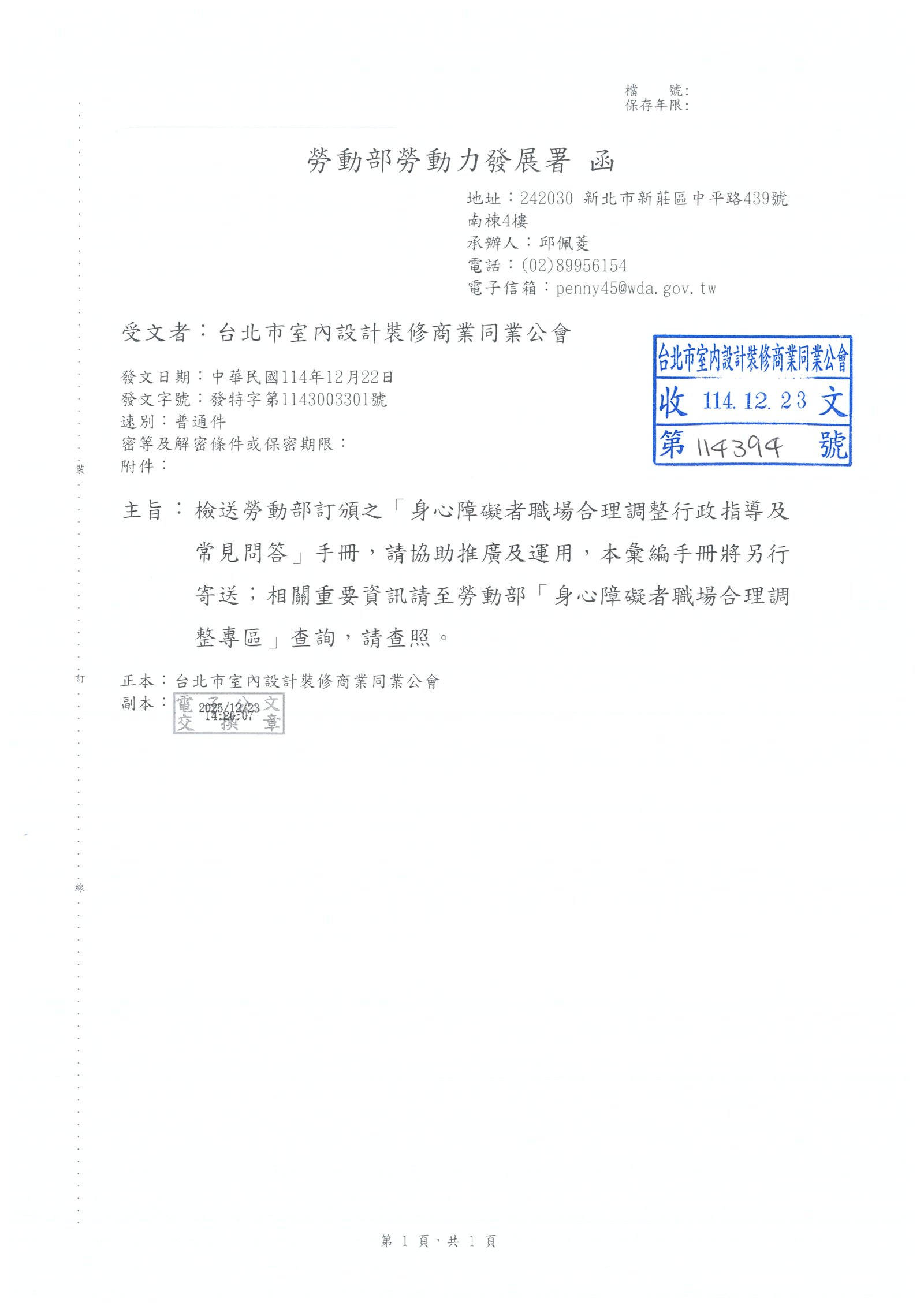 最新消息 一般公文 轉知公文 代轉活動 全國公會重要公文 公會活動花絮 招標公告 114年度 115年度 研討活動/會議 廠商訊息 一般公文 轉知公文 代轉活動 全國公會重要公文 公會活動花絮 招標公告 114年度 115年度 研討活動/會議 廠商訊息 勞動部勞動力發展署 檢送勞動部訂頒之「身心障礙者職場合理調整行政指導及常見問答」手冊,請協助推廣及運用,本彙編手冊將另行寄送;相關重要資訊請至勞動部「身心障礙者職場合理調整專區」查詢,請查照。 文章分類 : 轉知公文 發文單位 : 勞動部勞動力發展署 發文字號 : 發特字第1143003301號 收文日期 : 114-12-23 手冊(電子書) <<點擊前往>>