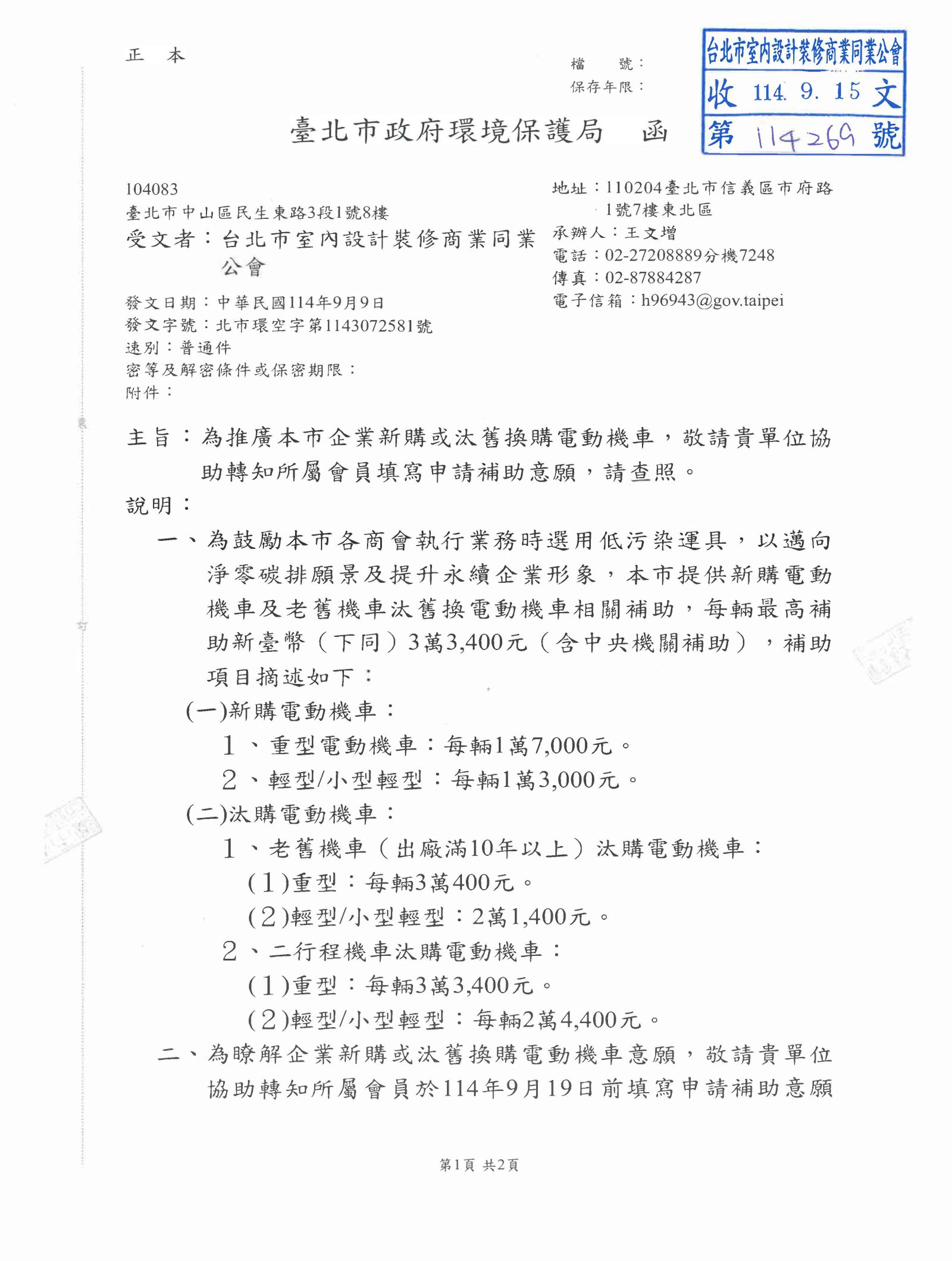 最新消息 一般公文 轉知公文 代轉活動 全國公會重要公文 公會活動花絮 招標公告 114年度 115年度 研討活動/會議 廠商訊息 一般公文 轉知公文 代轉活動 全國公會重要公文 公會活動花絮 招標公告 114年度 115年度 研討活動/會議 廠商訊息 臺北市政府環境保護局 主旨:為推廣本市企業新購或汰舊換購電動機車,敬請貴單位協助轉知所屬會員填寫申請補助意願,請查照。 文章分類 : 轉知公文 發文單位 : 臺北市政府環境保護局 發文字號 : 北市環空字第1143072581號 收文日期 : 114-09-09 補助計畫連結 <<點擊前往>>
