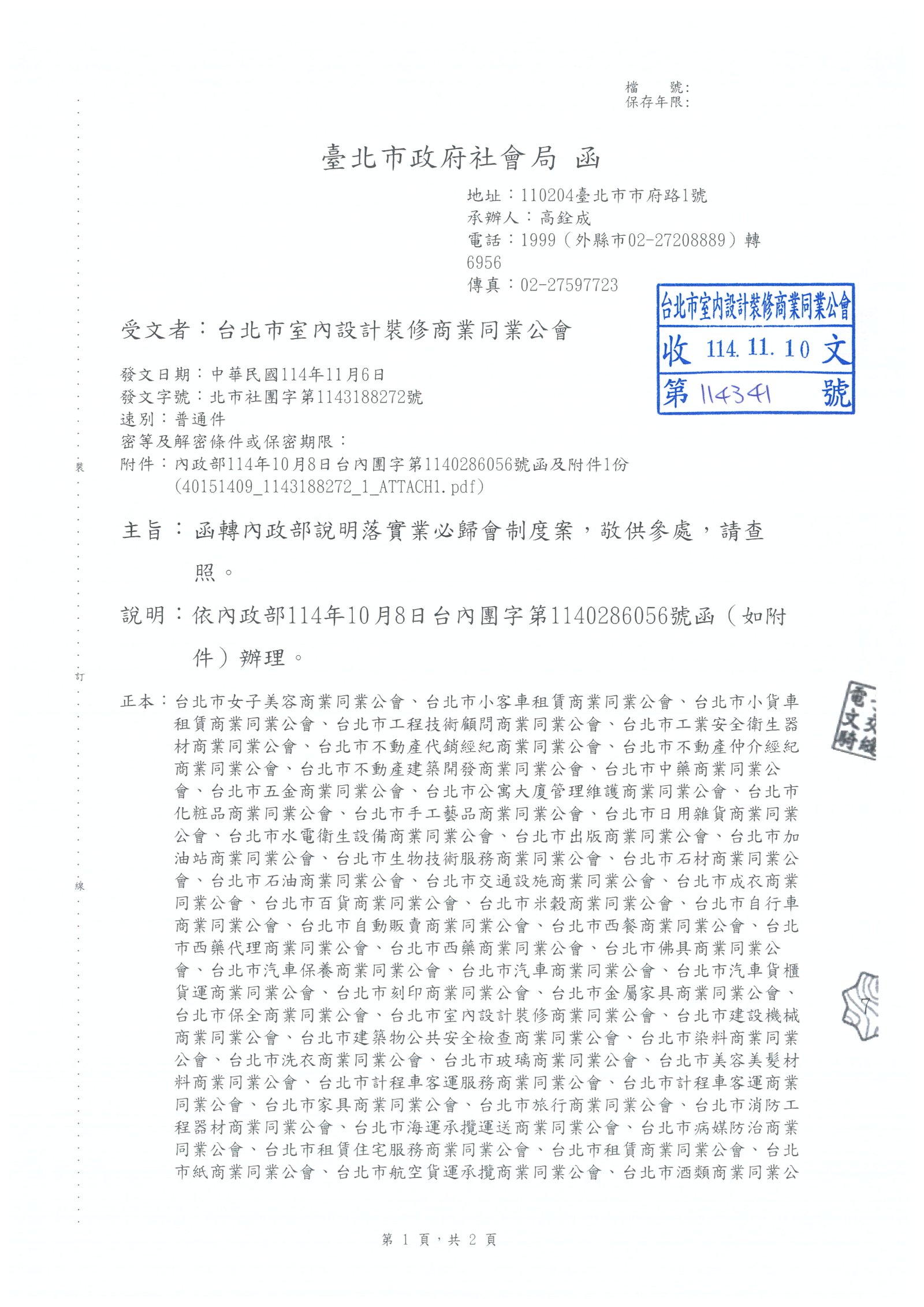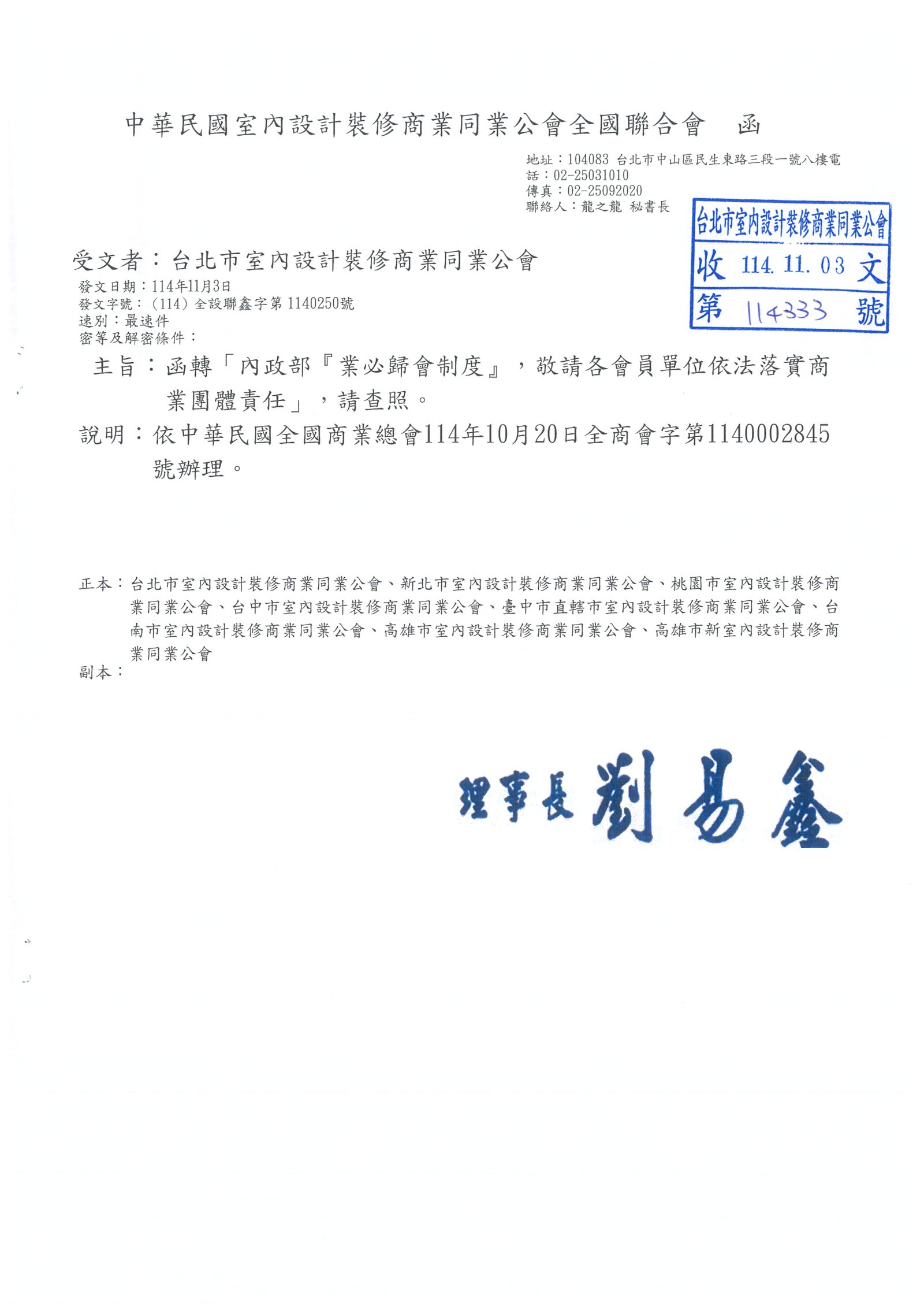 最新消息 一般公文 轉知公文 代轉活動 全國公會重要公文 公會活動花絮 招標公告 114年度 115年度 研討活動/會議 廠商訊息 一般公文 轉知公文 代轉活動 全國公會重要公文 公會活動花絮 招標公告 114年度 115年度 研討活動/會議 廠商訊息 台北市政府社會局 「內政部『業必歸會制度』,敬請各會員單位依法落實商業團體責任」 函轉「內政部『業必歸會制度』,敬請各會員單位依法落實商業團體責任」,請查照。 業必歸會制度 <<點擊前往>>