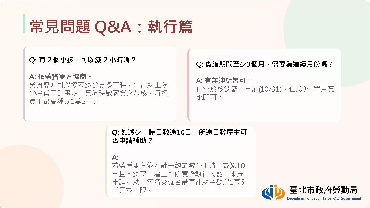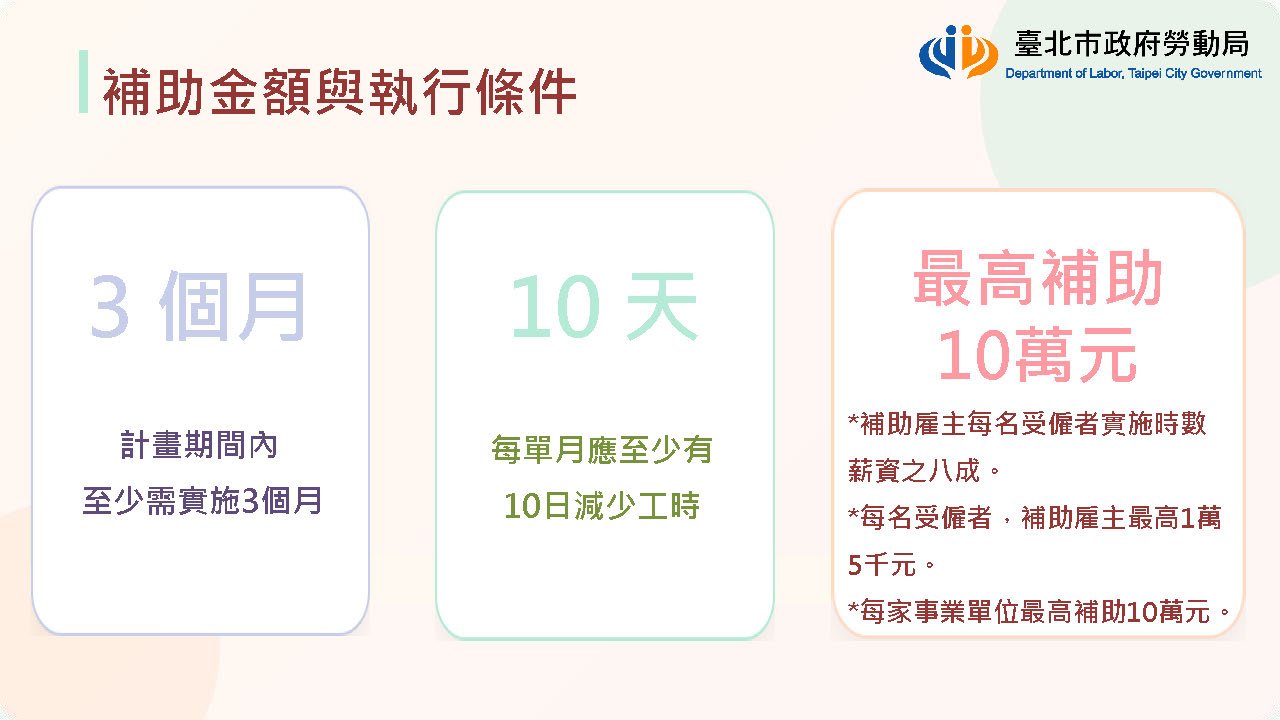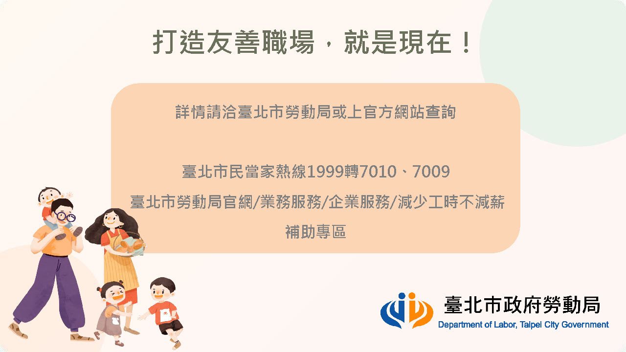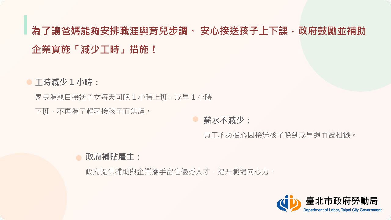 為鼓勵企業打造友善職場環境,臺北市政府勞動局推出 「115年度補助事業單位於員工育兒期間減少工時實施計畫」。凡設立於臺北市的事業單位,若提供育有 12歲以下子女、且有實際接送需求的員工,於上班當日 減少1小時工時且不減薪,即可依規定申請補助。臺北市政府表示,補助金額為減少工時所對應薪資的 8成,每名受僱者每年最高補助新臺幣1萬5,000元,每家事業單位最高補助10萬元。