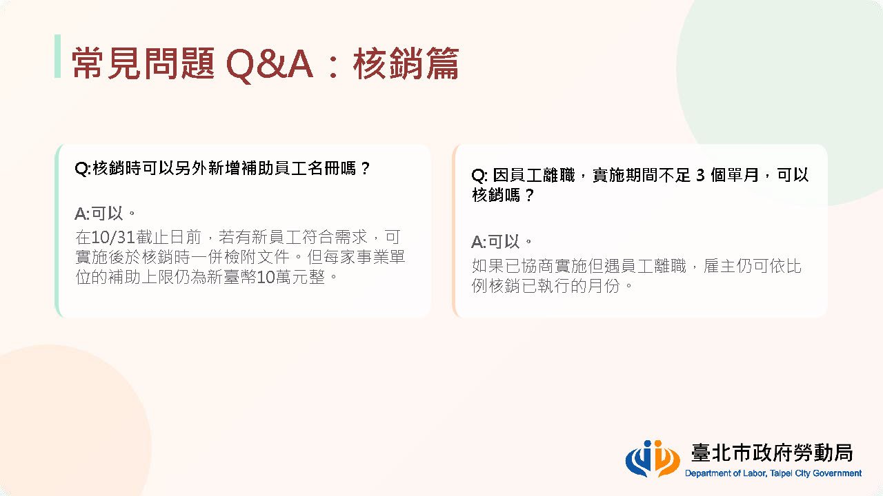 勞動局也說明,目前本計畫主要適用於 全時工作者,兼職人員及居家工作者目前不在補助對象內。此外,若事業單位於核銷期限前,仍有其他符合條件的員工加入實施名單,原則上也可於核銷時一併提出,但整體補助仍以每家最高10萬元為上限。
