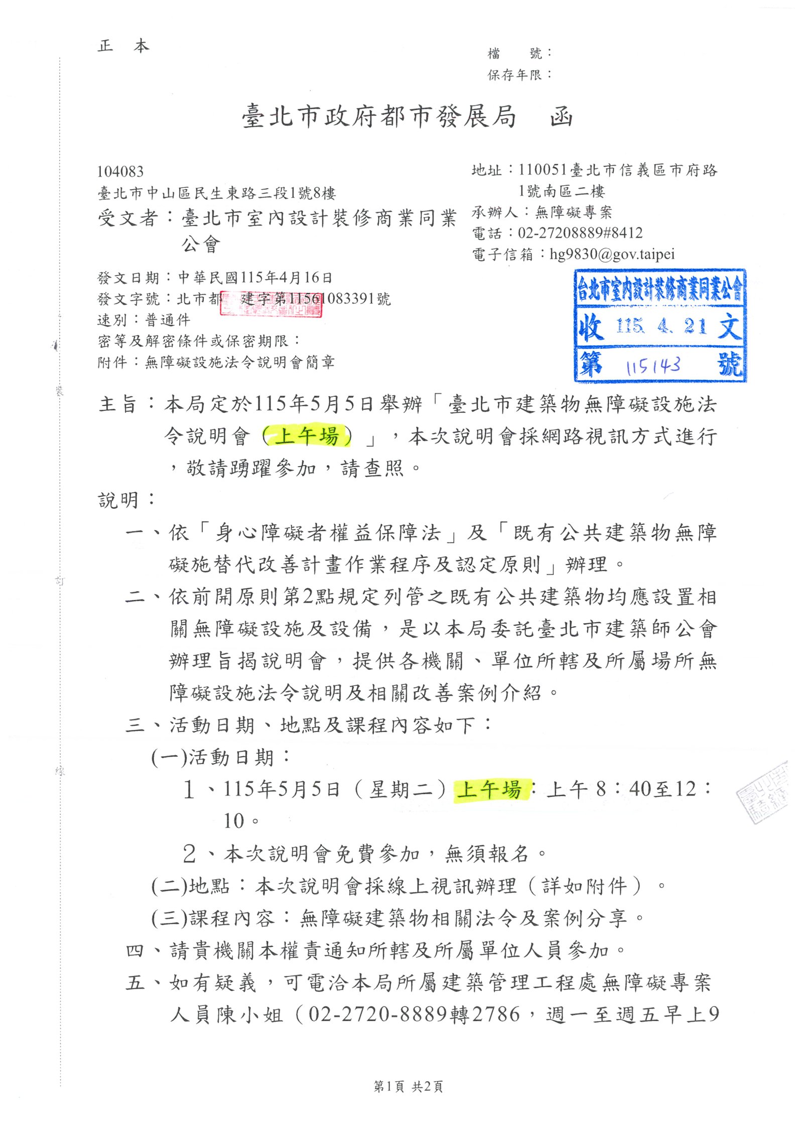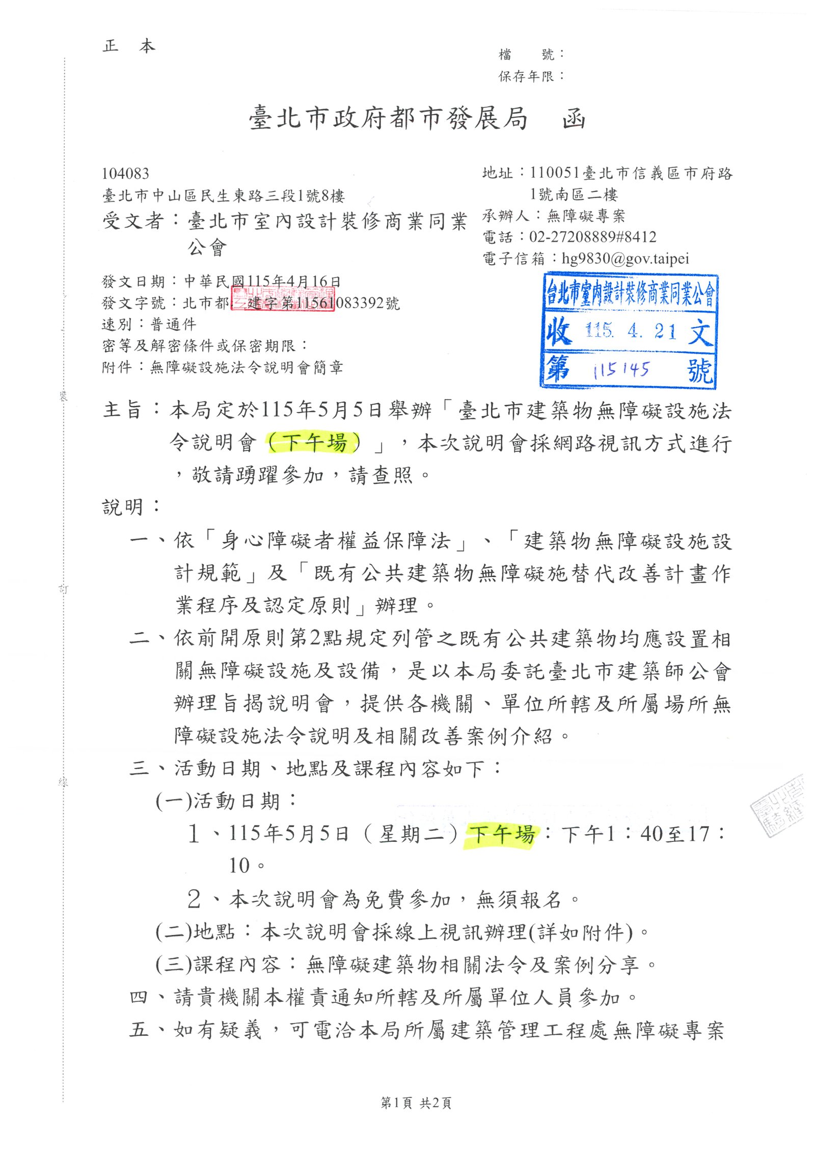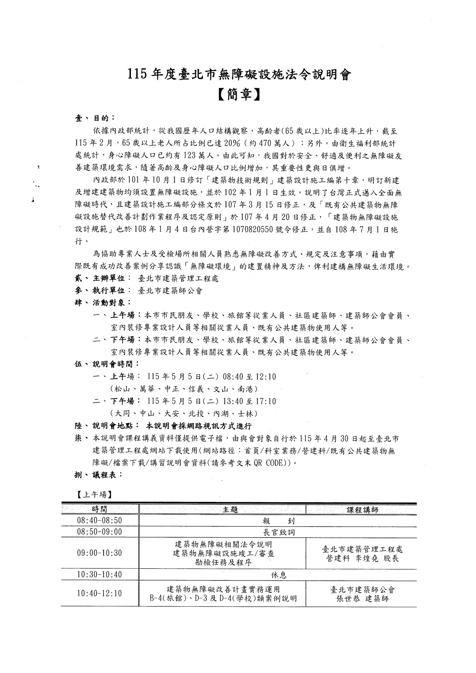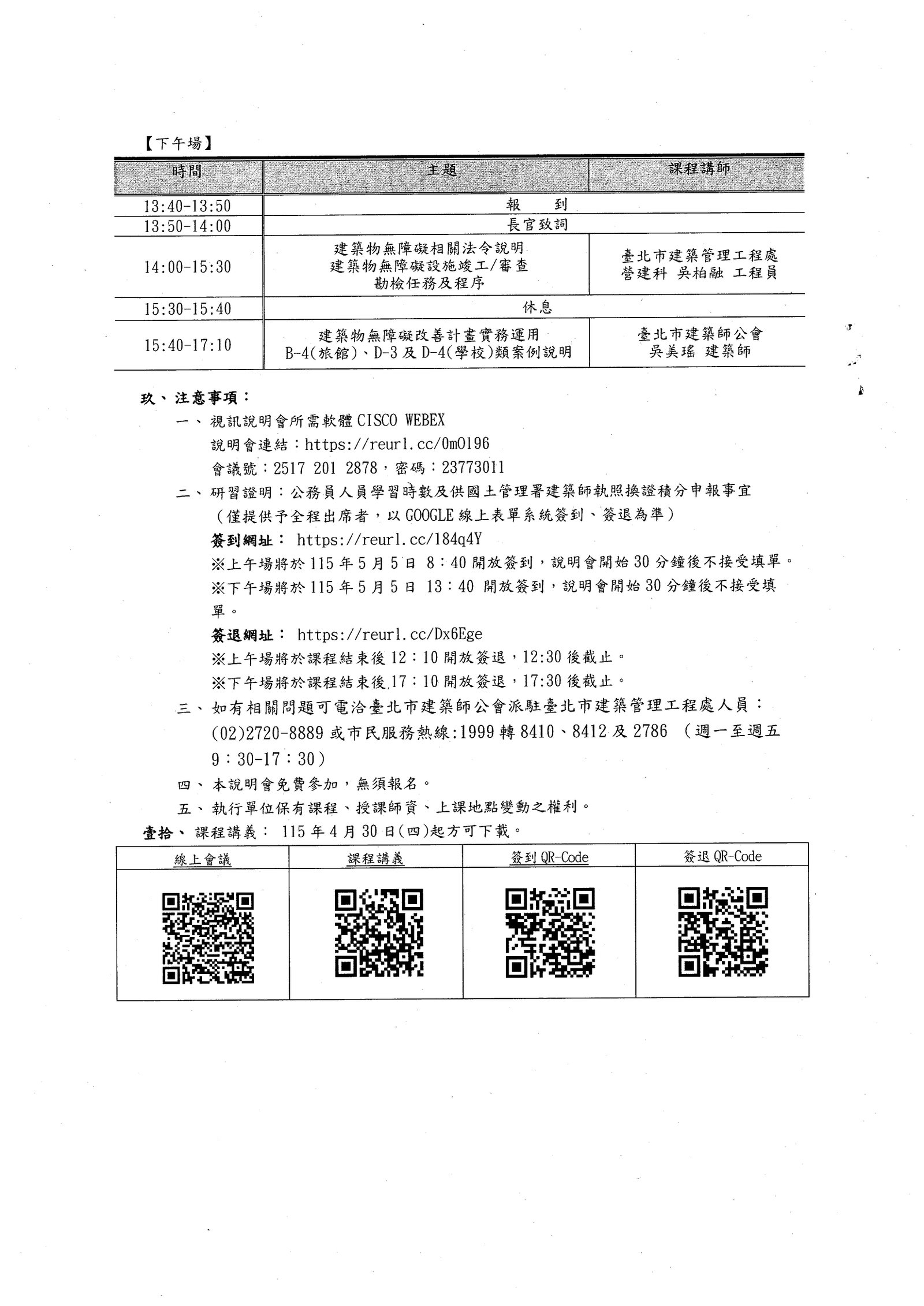 本局定於115年5月5日舉辦「臺北市建築物無障礙設施法令說明會(上午場)及(下午場)」,本次說明會採網路視訊方式進行,敬請踴躍參加,請查照。
