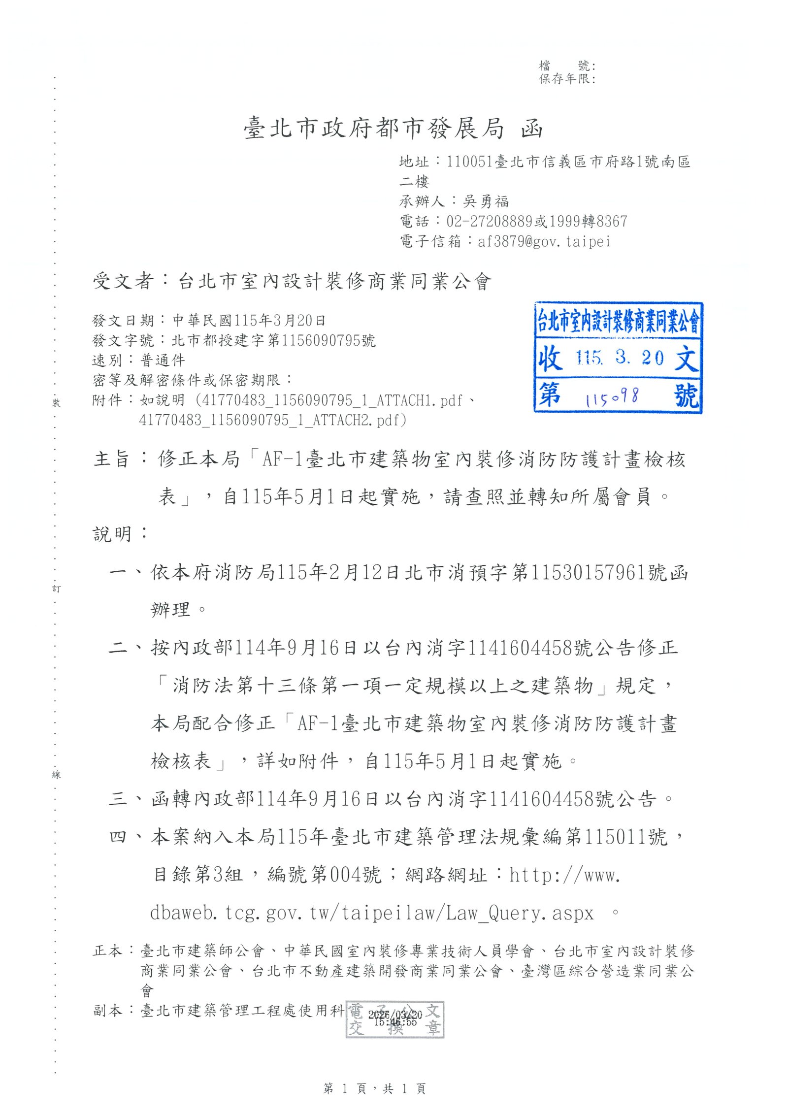 最新消息 一般公文 轉知公文 代轉活動 全國公會重要公文 公會活動花絮 招標公告 114年度 115年度 研討活動/會議 廠商訊息 一般公文 轉知公文 代轉活動 全國公會重要公文 公會活動花絮 招標公告 114年度 115年度 研討活動/會議 廠商訊息 臺北市政府都市發展局 修正本局「AF-1臺北市建築物室內裝修消防防護計畫檢核表」,自115年5月1日起實施,請查照並轉知所屬會員。 文章分類 : 轉知公文 發文單位 : 臺北市政府都市發展局 發文字號 : 北市都授建字第1156090795號 收文日期 : 115-03-20