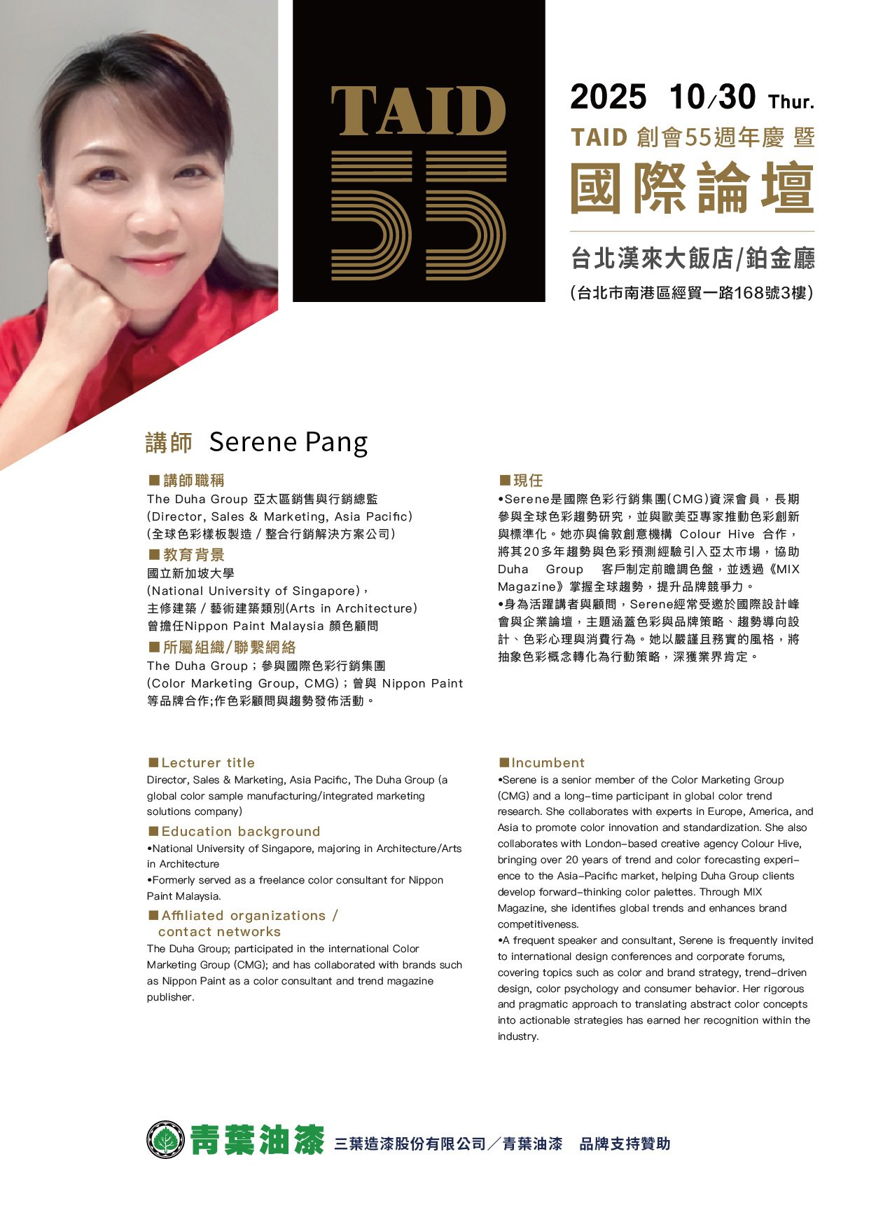 Serene 是國際色彩行銷集團(CMG)資深會員,長期參與全球色彩趨勢研究,並與歐美亞專家推動色彩創新與標準化。她亦與倫敦創意機構 Colour Hive 合作,將其二十多年趨勢與色彩預測經驗引入亞太市場,協助 Duha Group 客戶制定前瞻調色盤,並透過《MIX Magazine》掌握全球趨勢,提升品牌競爭力。