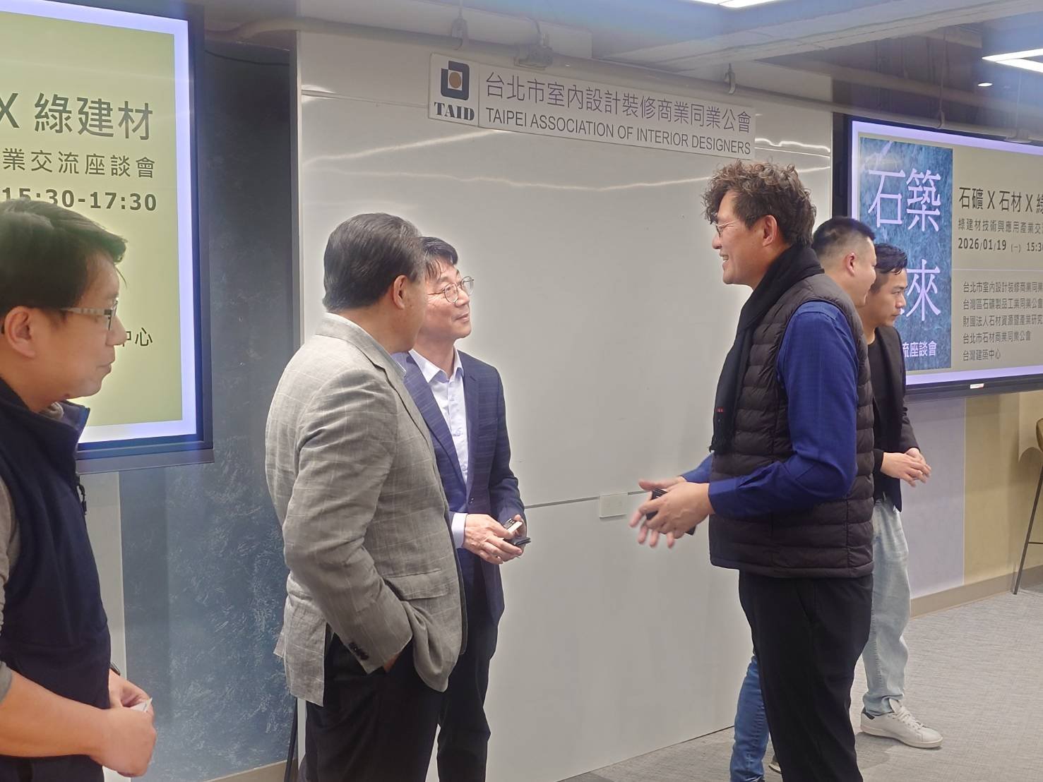 為促進石礦與石材產業於永續建築與綠建材領域之應用發展,台北市室內設計裝修商業同業公會(TAID)於 115 年 1 月 19 日下午,在 TAID 人文講堂舉辦「石礦與石材產業綠建材技術與應用交流座談會」,由謝坤學理事長主持,邀集產業代表與相關單位齊聚一堂,透過跨域交流,深入探討天然石材於室內設計與建築空間中的創新應用,以及綠建材認證制度的實務挑戰與優化方向。