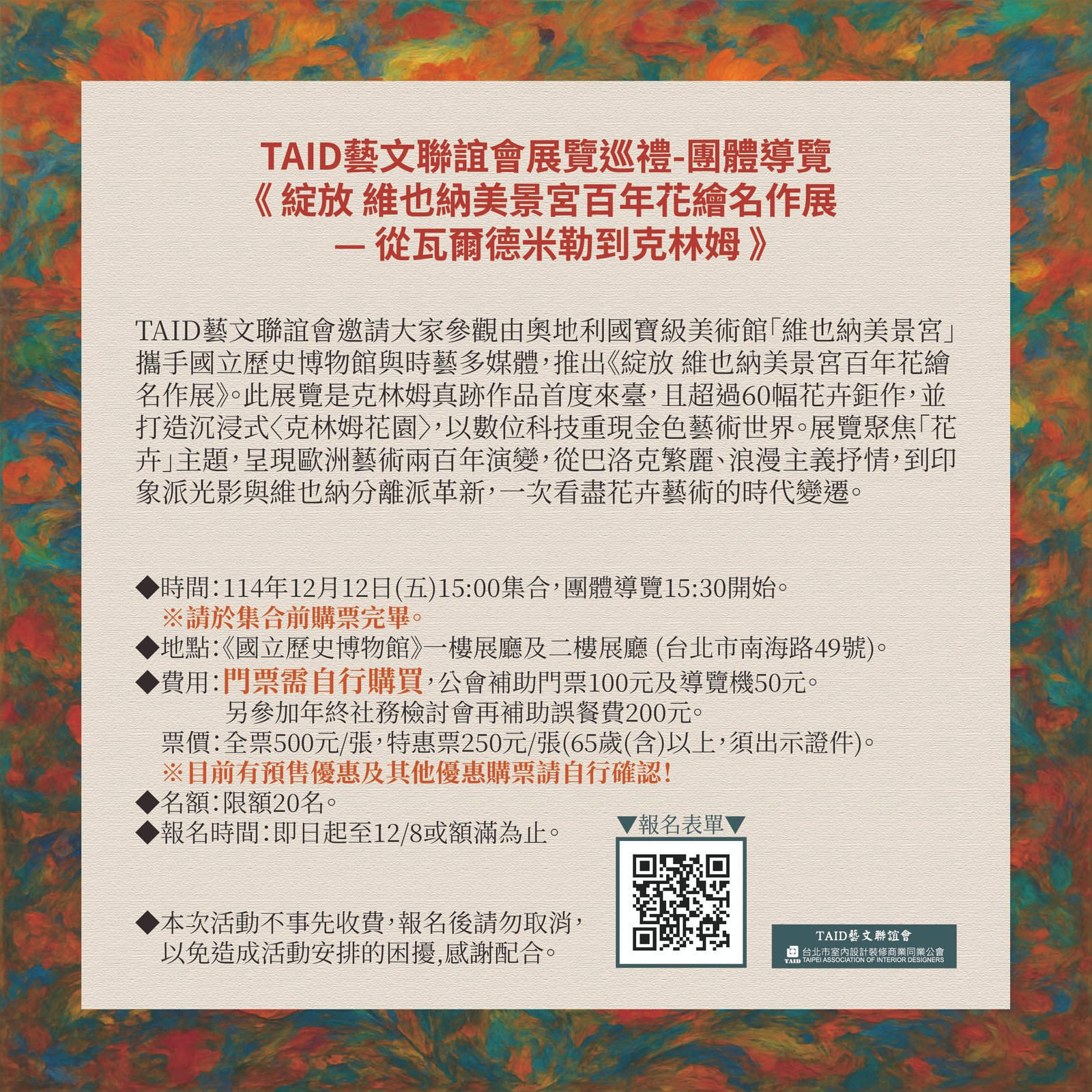 報名專區 公會講座/課程 友會講座/課程 聯誼社活動 參訪/旅遊活動 活動行事曆 人文講堂空間租借 公會講座/課程 友會講座/課程 聯誼社活動 參訪/旅遊活動 活動行事曆 人文講堂空間租借 TAID藝文聯誼社 活動報名 綻放 維也納美景宮百年花繪名作展 -團體導覽 誠摯邀請一同欣賞奧地利「維也納美景宮」珍藏花卉名作,從巴洛克到印象派、維也納分離派,感受百年藝術綻放之美。📌時間:114/12/12(五) 15:00集合,15:30準時導覽📌地點:國立歷史博物館(南海路49號)📌費用:門票自理;公會補助150元(全票500元/優待票250元)※另參加藝文聯誼會年終社務檢討會者,再補助誤餐費200元📌名額:20名📌報名:即日起至12/08或額滿止 (活動人數不足已取消辦理)👉活動報名連結