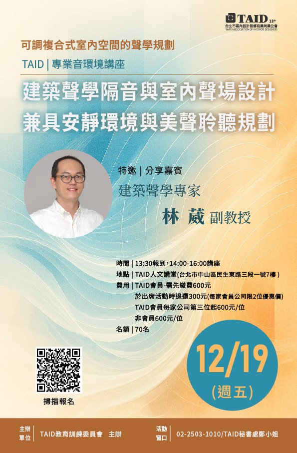 最新消息 一般公文 轉知公文 代轉活動 全國公會重要公文 公會活動花絮 招標公告 114年度 115年度 研討活動/會議 廠商訊息 一般公文 轉知公文 代轉活動 全國公會重要公文 公會活動花絮 招標公告 114年度 115年度 研討活動/會議 廠商訊息 TAID|專業課程 音環境講座【可調複合式室內空間的聲學規劃】 特邀《建築聲學專家 林葳副教授》,帶領大家深入探索「沉浸式複合室內空間」的聲音祕密:建築聲學隔音與室內聲場設計兼具安靜環境與美聲聆聽規劃分享。 讓我們一起重新認識空間的另一個維度──聲音,為你的設計作品加上一道常被忽略卻極具價值的專業能力💪📍時間:12/19(五)13:30報到,14:00-16:00講座📍地點:TAID人文講堂(台北市中山區民生東路三段1號7樓 )📍講師:逢甲大學副教授林葳📍費用:1.TAID會員-需先繳費600元.於出席活動時退還300元(每家會員公司限2位優惠價) 2.TAID會員每家公司第三位起600元/位 3.非會員600元/位📍名額:限制70名🎯主辦單位:TAID教育訓練委員會👉線上報名(請點選前往報名)🔗
