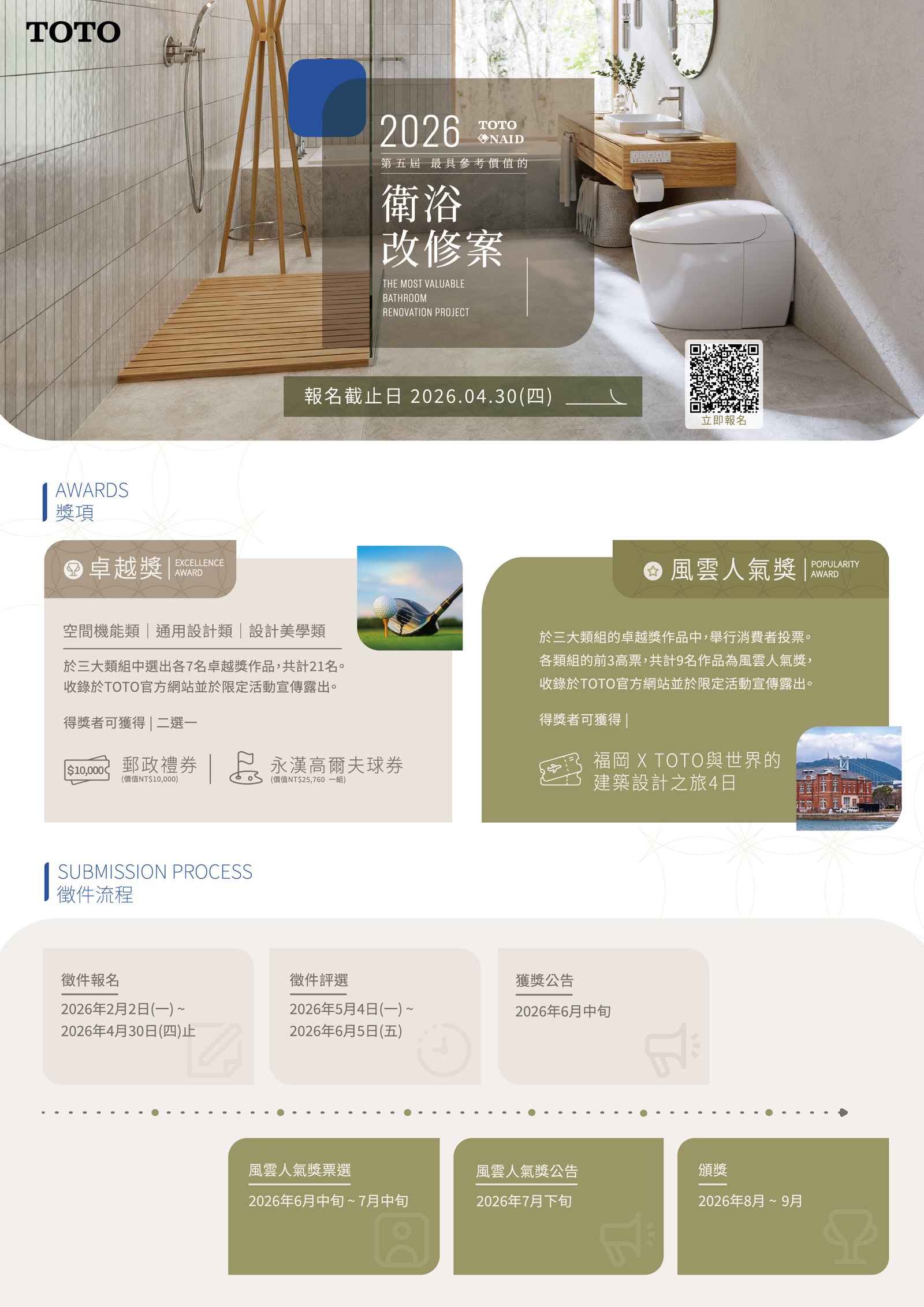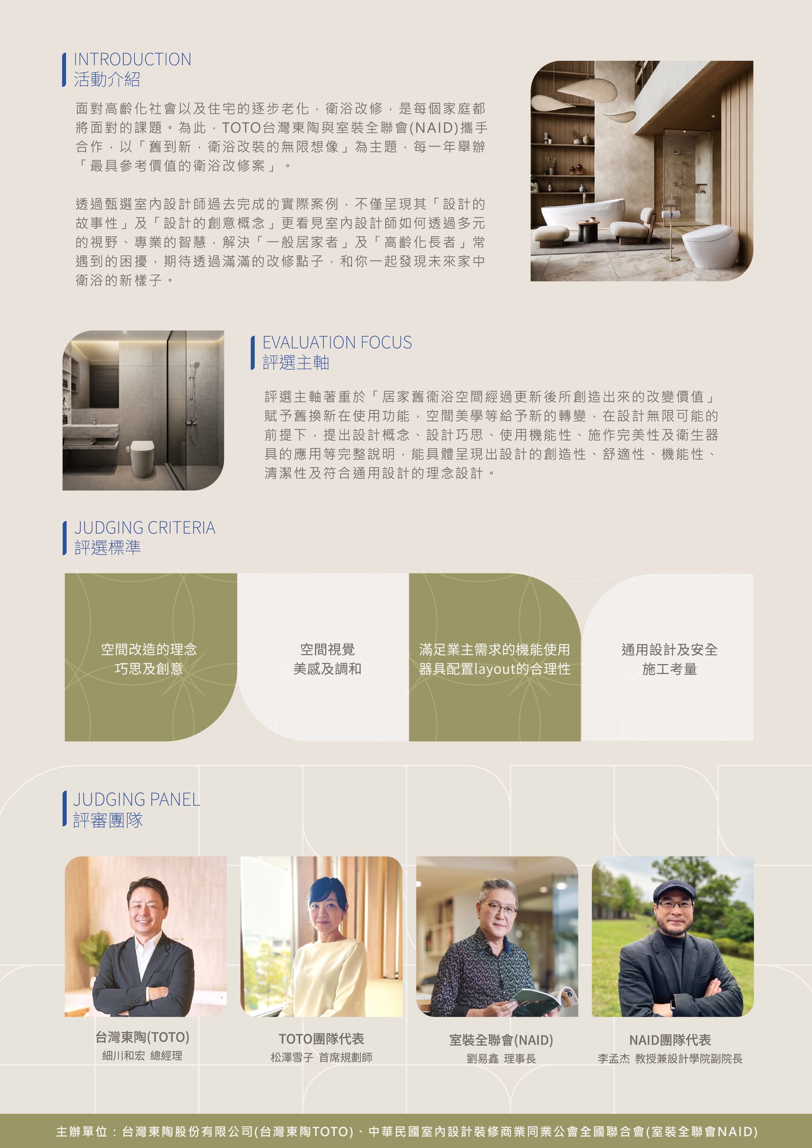 最新消息 一般公文 轉知公文 代轉活動 全國公會重要公文 公會活動花絮 招標公告 114年度 115年度 研討活動/會議 廠商訊息 一般公文 轉知公文 代轉活動 全國公會重要公文 公會活動花絮 招標公告 114年度 115年度 研討活動/會議 廠商訊息 TAID | 二月份-優良廠商 TOTO X NAID|2026第五屆衛浴改修徵件開始報名🖌️ TOTO X NAID|2026第五屆衛浴改修徵件開始報名TOTO與NAID攜手合作的「最具參考價值的衛浴改修案」以「舊到新,衛浴改裝的無限想像」為主題,期望藉由室內設計師多元的視野,改造台灣舊有的衛浴空間。【獎項】🏆卓越獎 — 21名得獎者可獲得 價值10,000元郵政禮券 or 價值25,760元永漢高爾夫球券一組🏆風雲人氣獎 — 9名於卓越獎脫穎而出的得獎者! 可再享🌸福岡 x TOTO 與世界的建築設計之旅 4 日✍️報名期間 : 2025/2/2至2025/4/30 活動詳見 <<點擊前往>>
