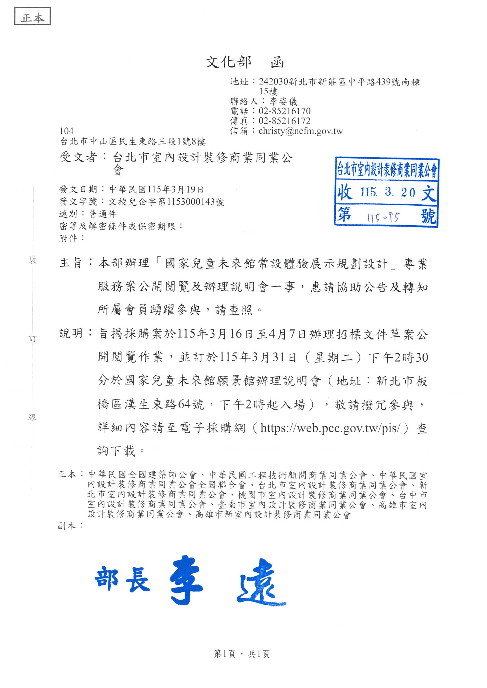 本部辦理「國家兒童未來館常設體驗展示規劃設計」專業服務案公開閱覽及辦理說明會一事,惠請協助公告及轉知所屬會員踴躍參與,請查照。